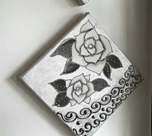 €80,00Scomposto caratterizzato da 2 tele gallery misura 20x50 l'una Decorate da inserti in legno.. particolari in foglia argento e strass Tempi di realizzazione 15 gg lavorativi circa Per maggiori informazioni WhatsApp 328-9210448