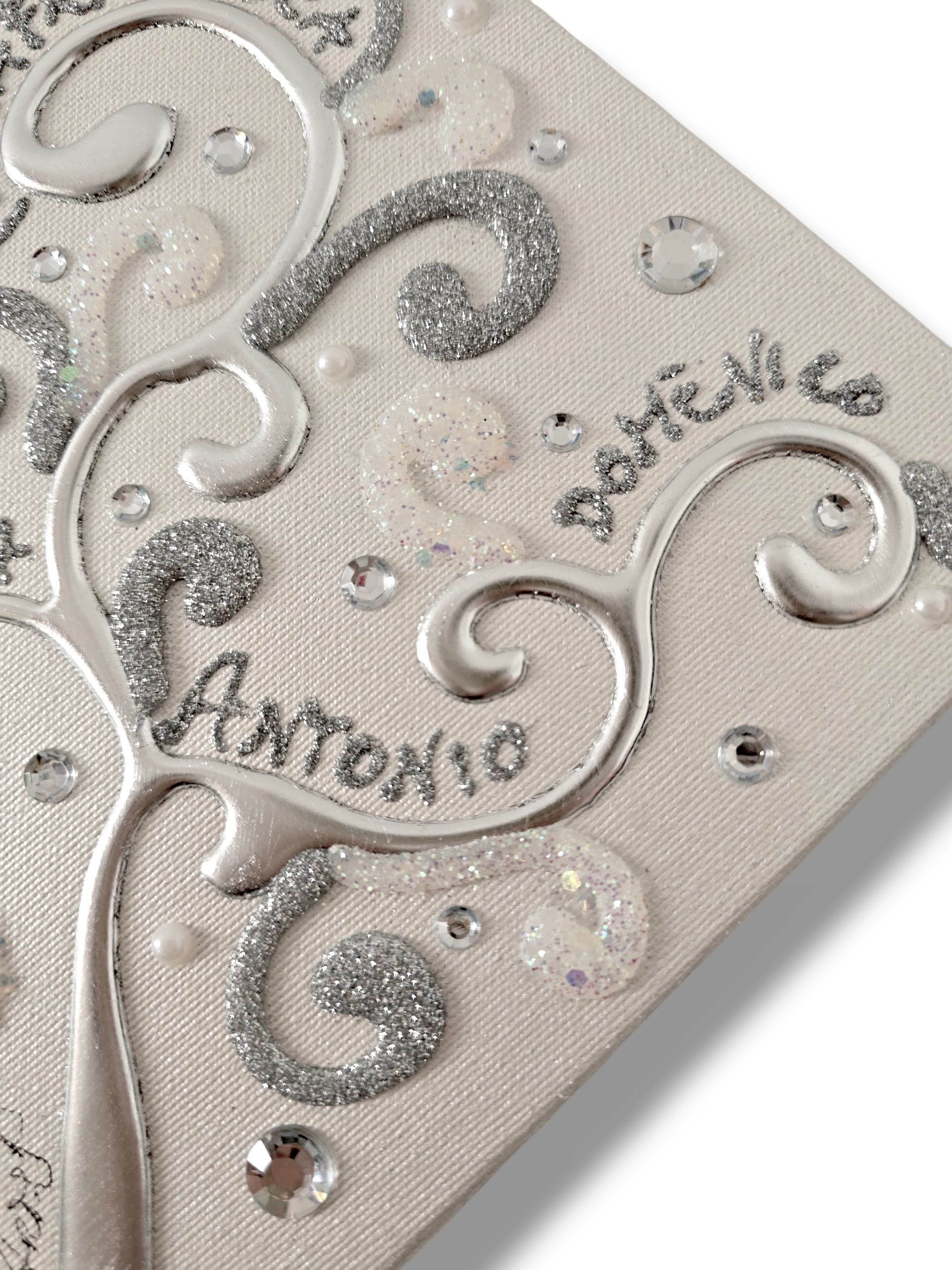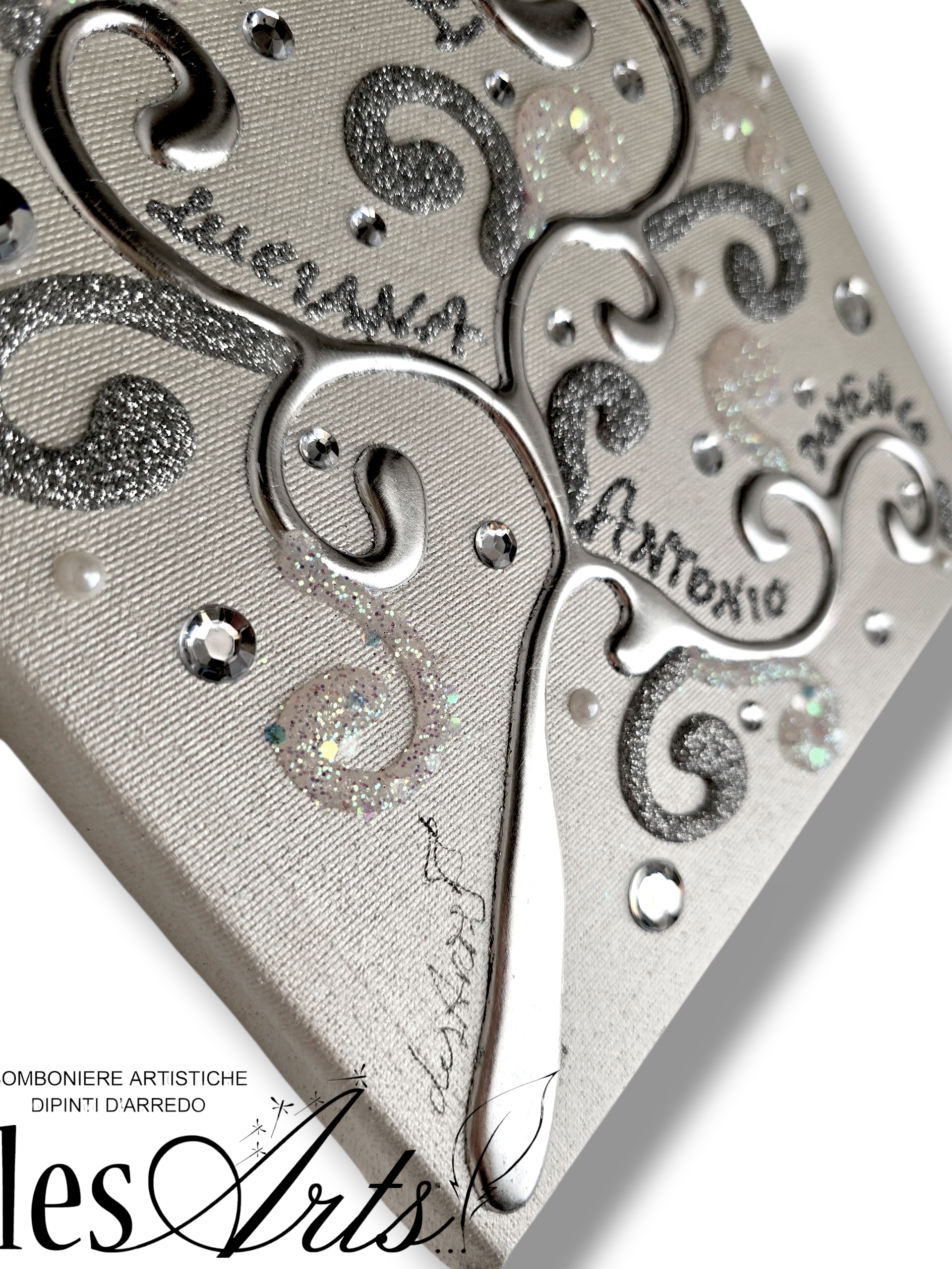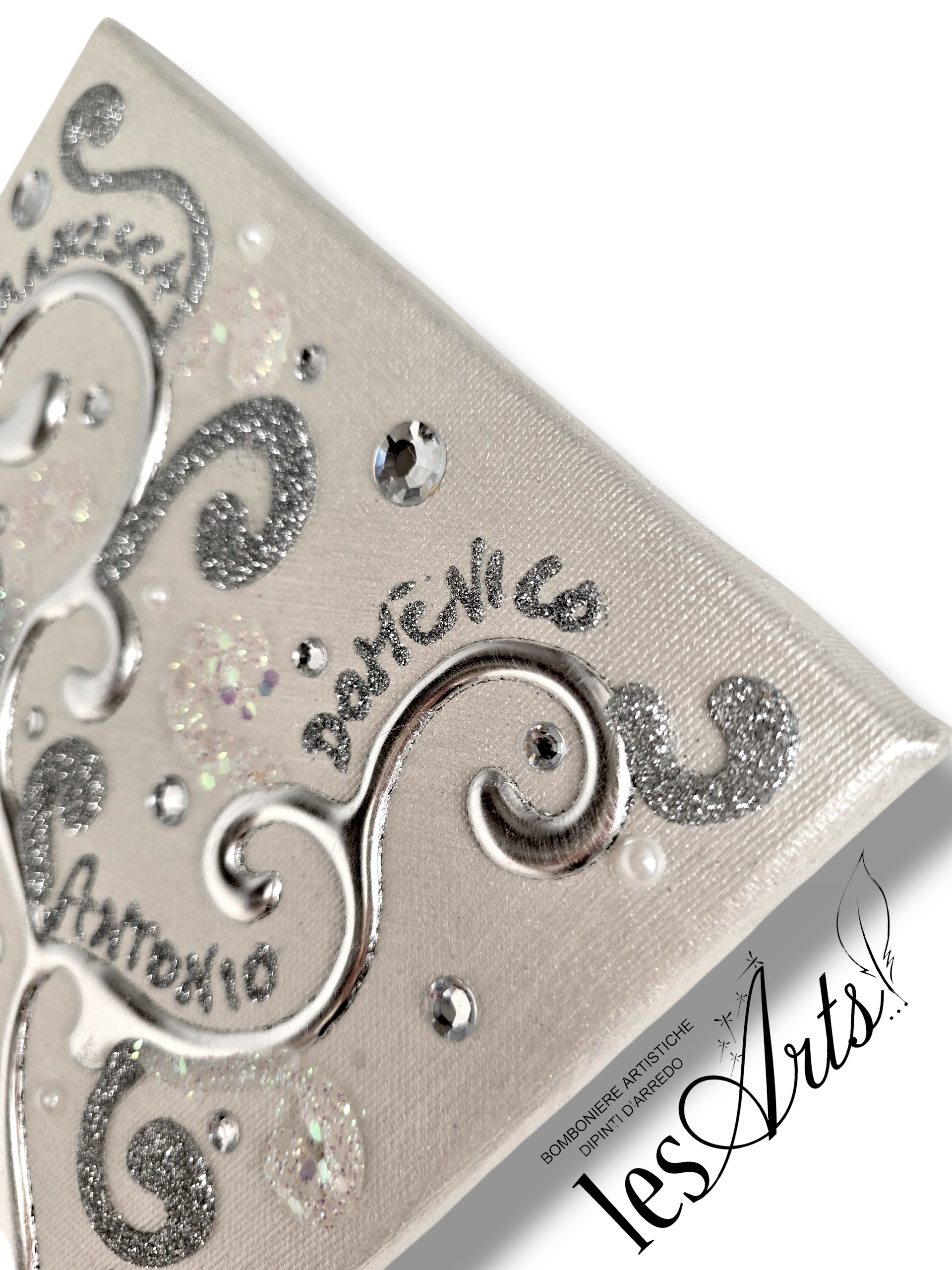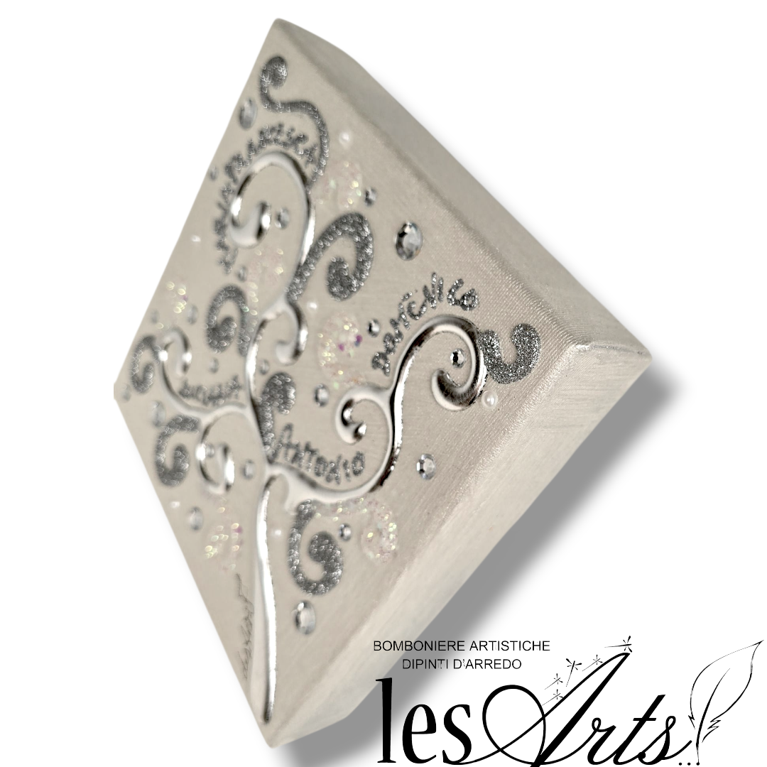 Impreziosito da particolari a rilievo in foglia Argento, Glitter, Strass e Perline.