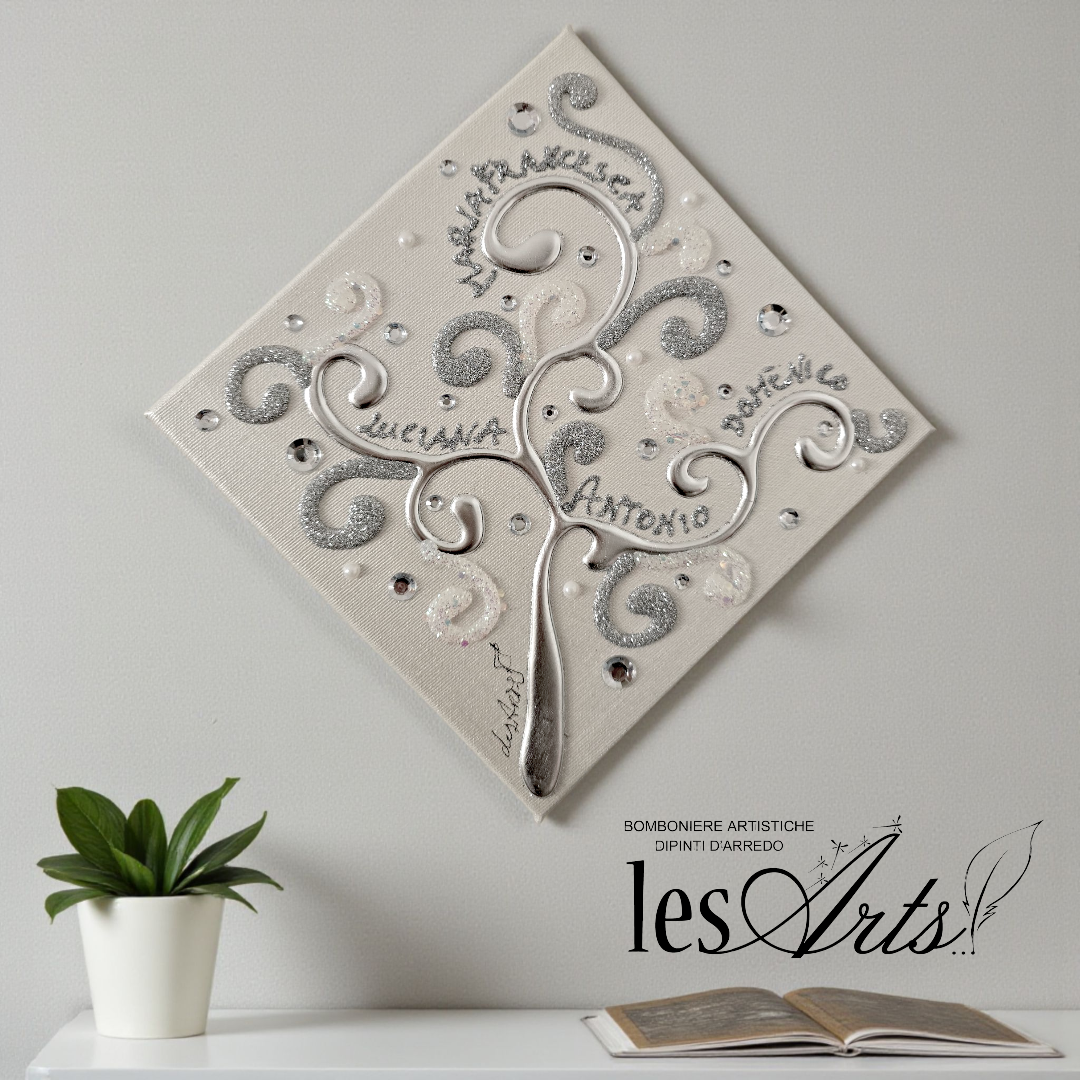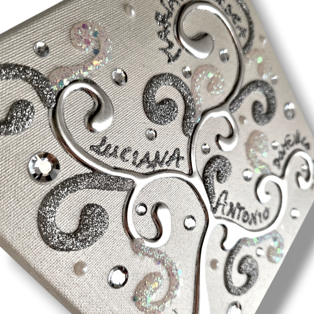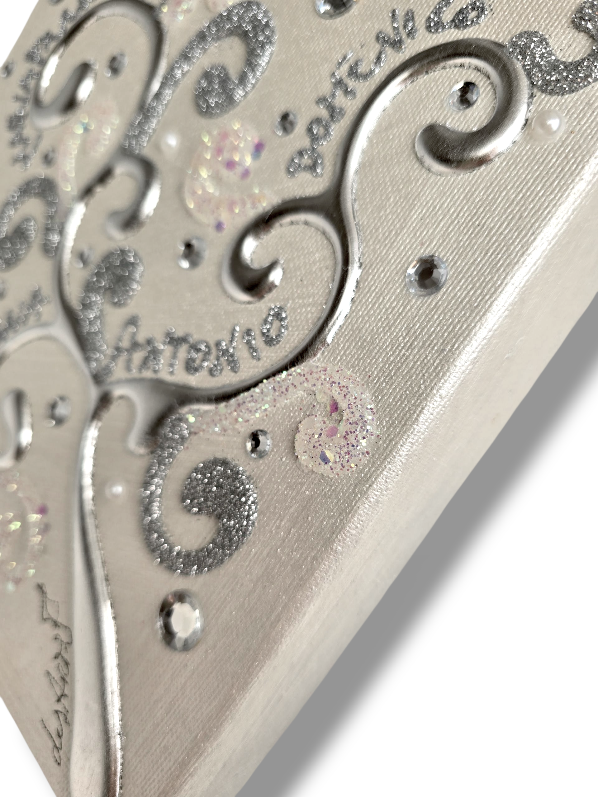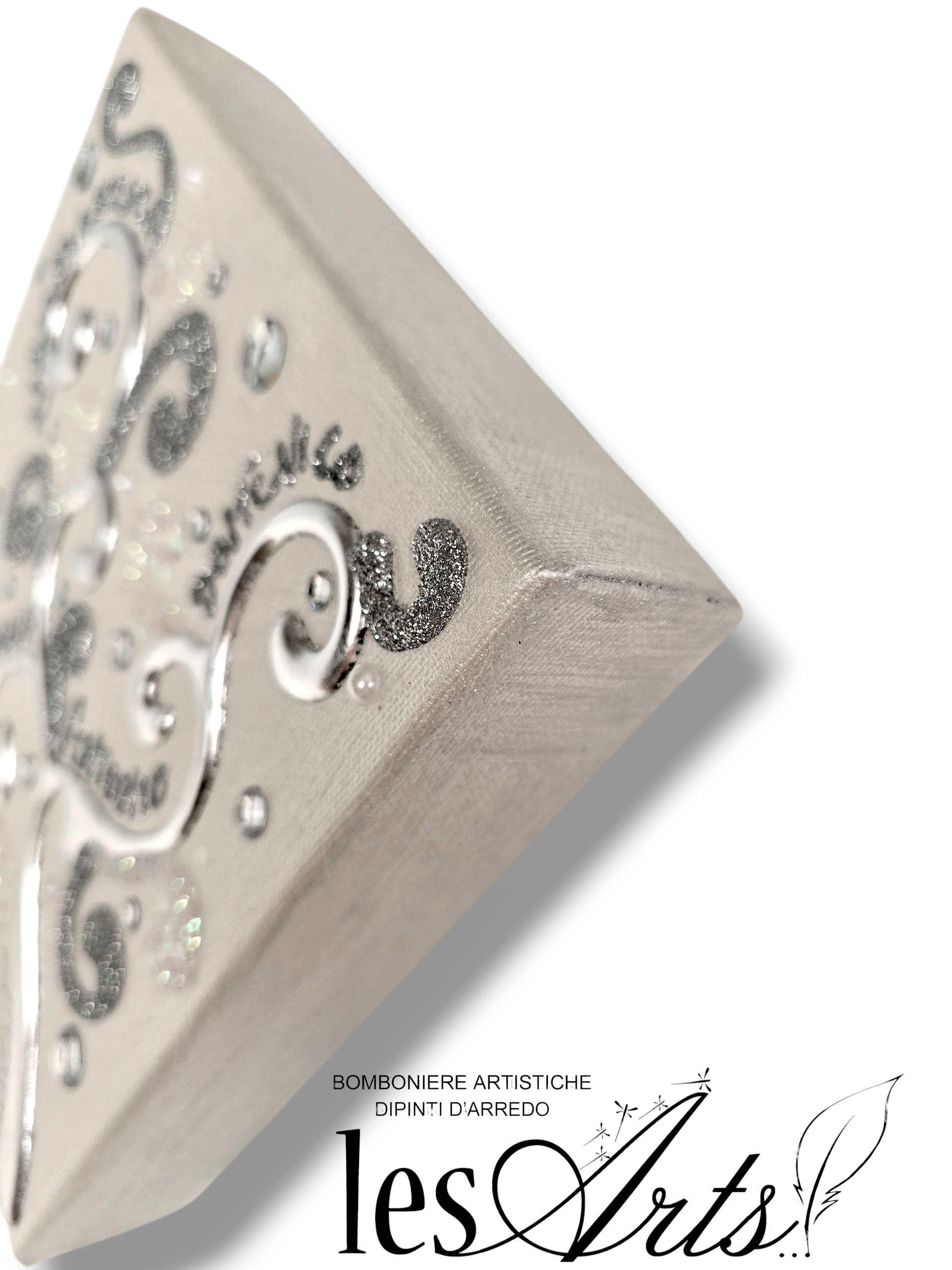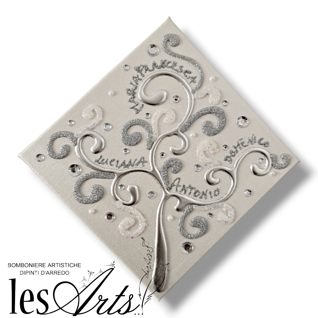 Impreziosito da particolari a rilievo in foglia Argento, Glitter, Strass e Perline.