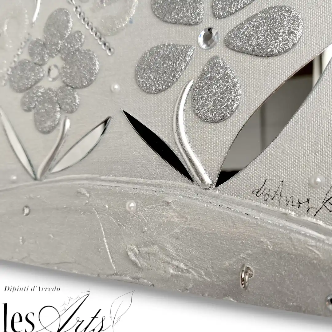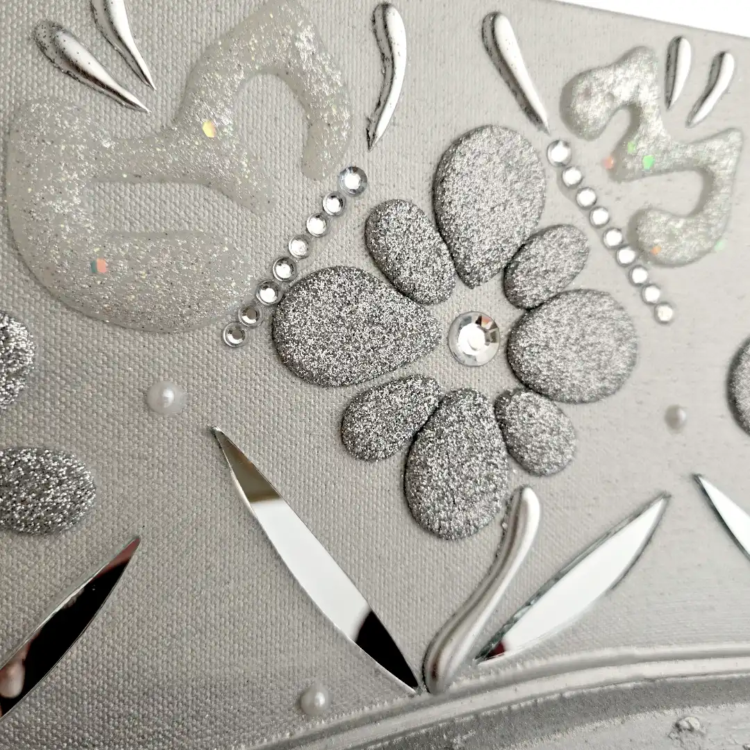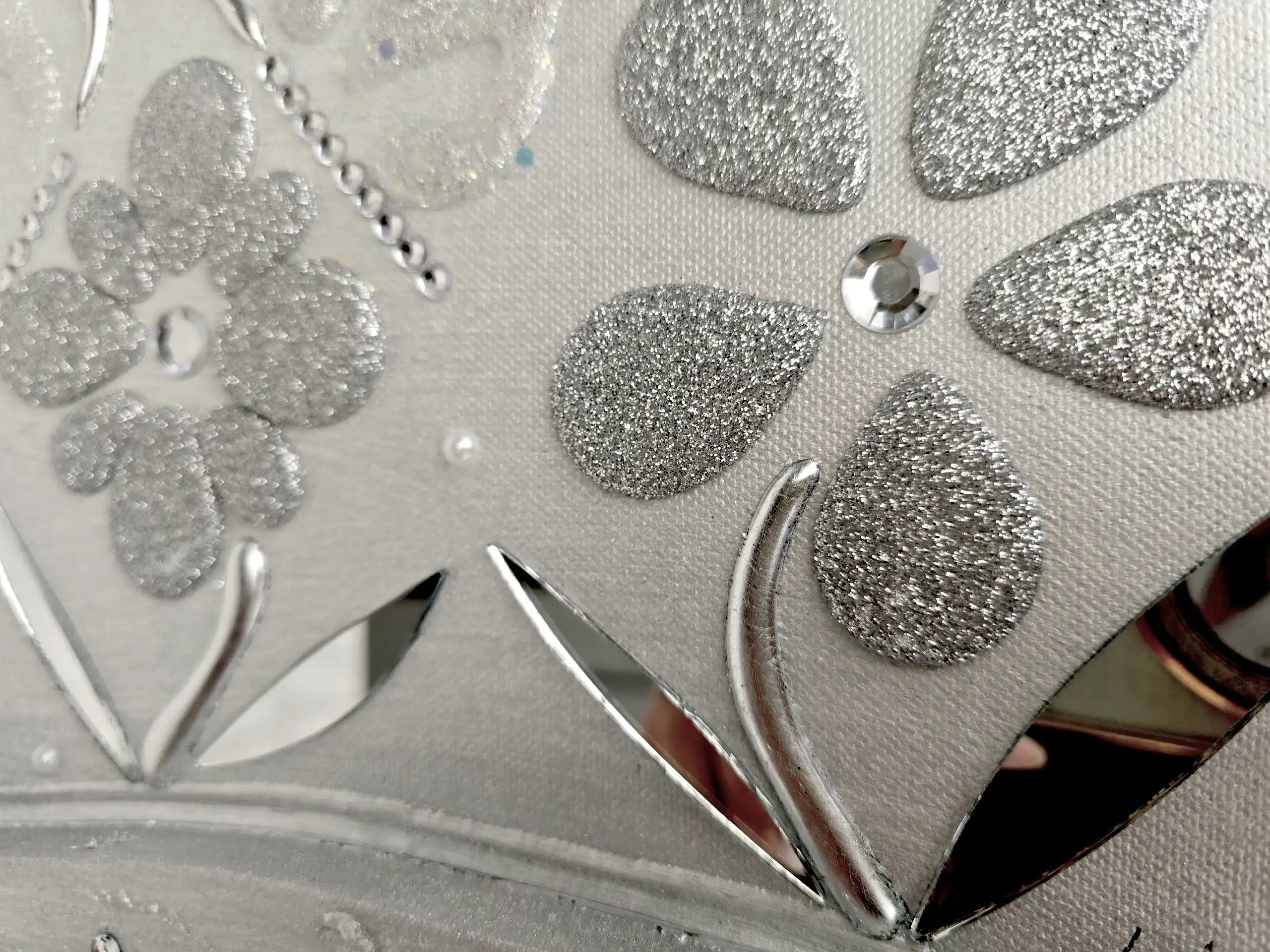 Impreziosito da particolari a rilievo in foglia Argento, Glitter, Specchietti, Strass e perline.