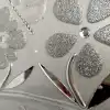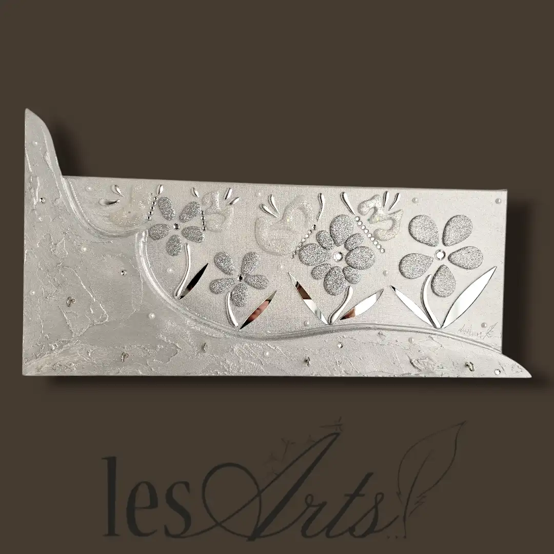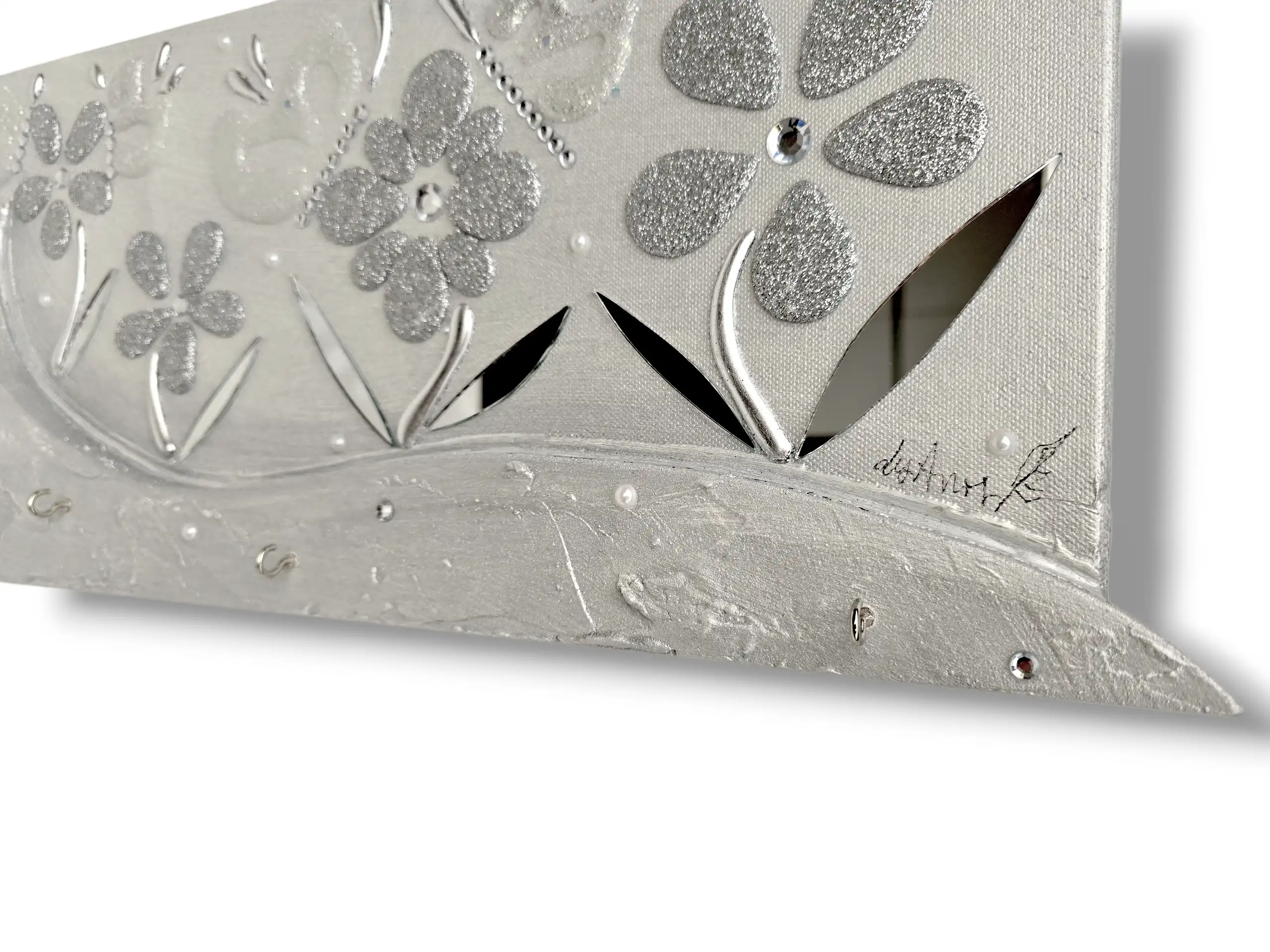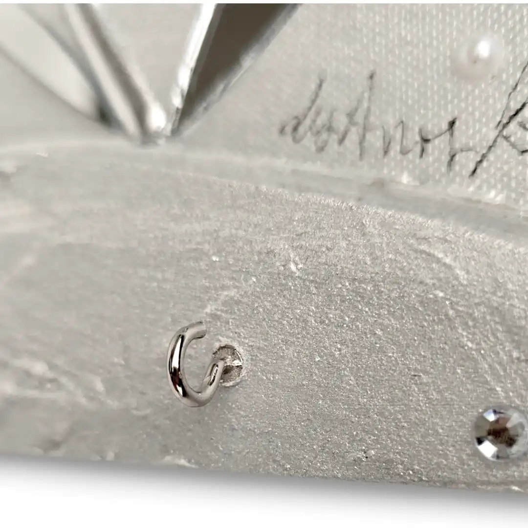 Impreziosito da particolari a rilievo in foglia Argento, Glitter, Specchietti, Strass e perline.
