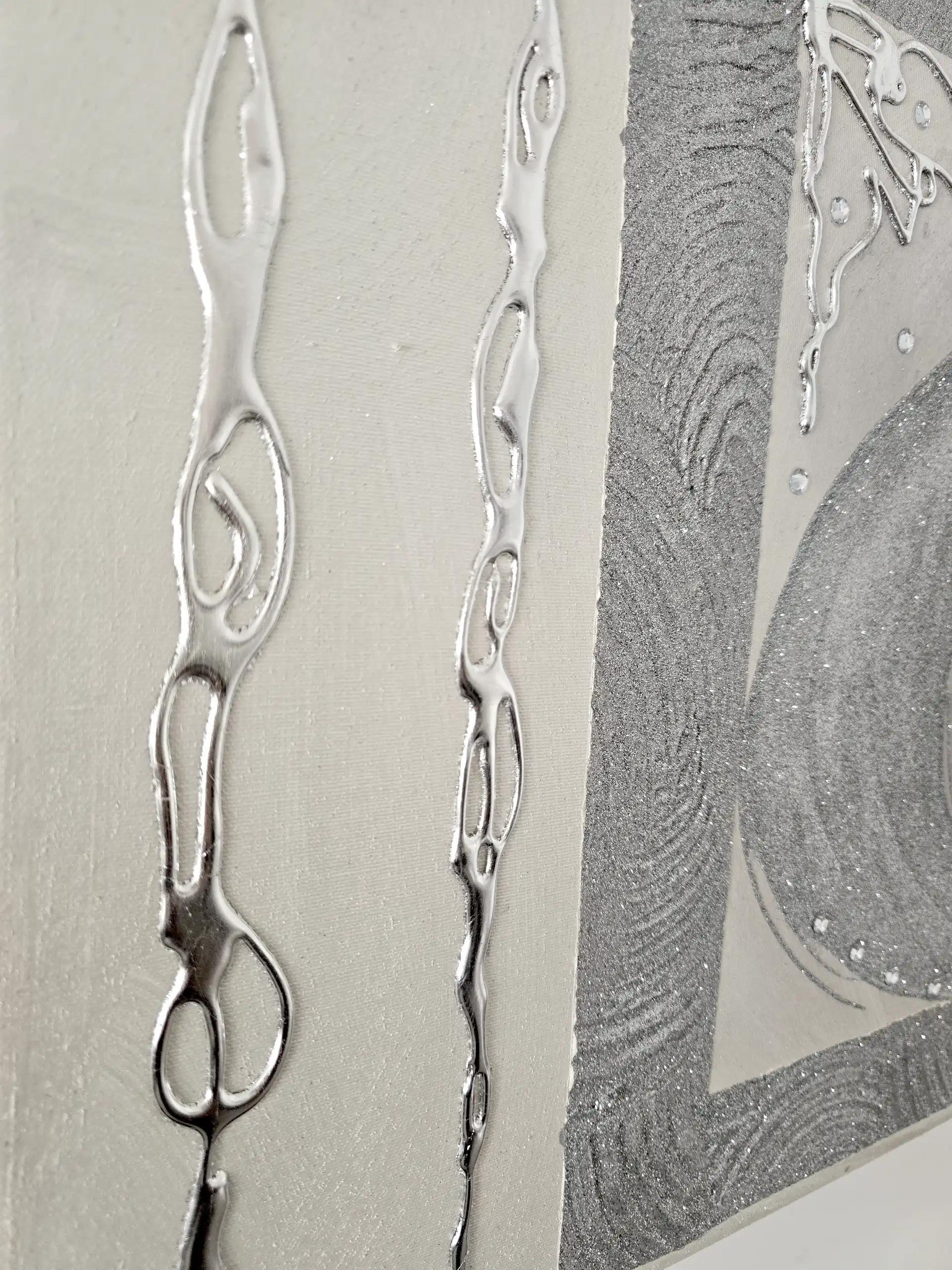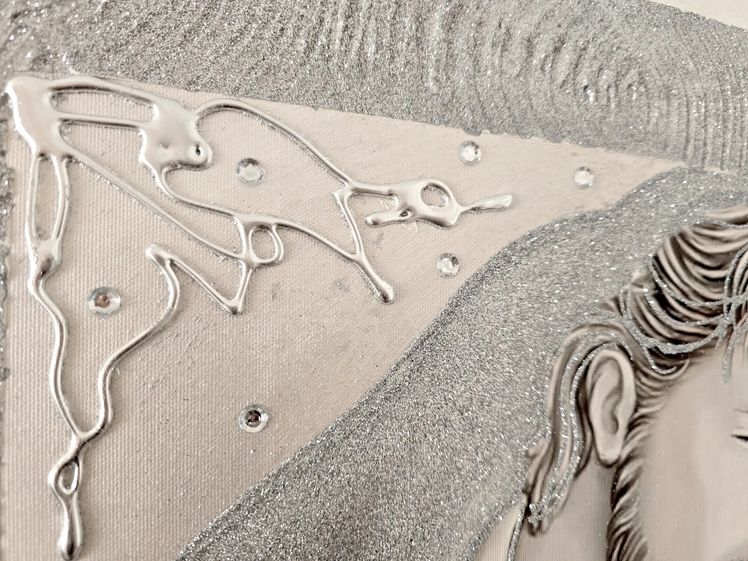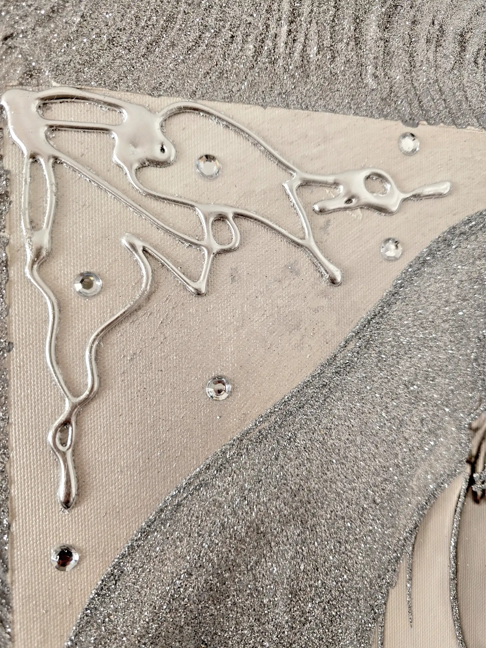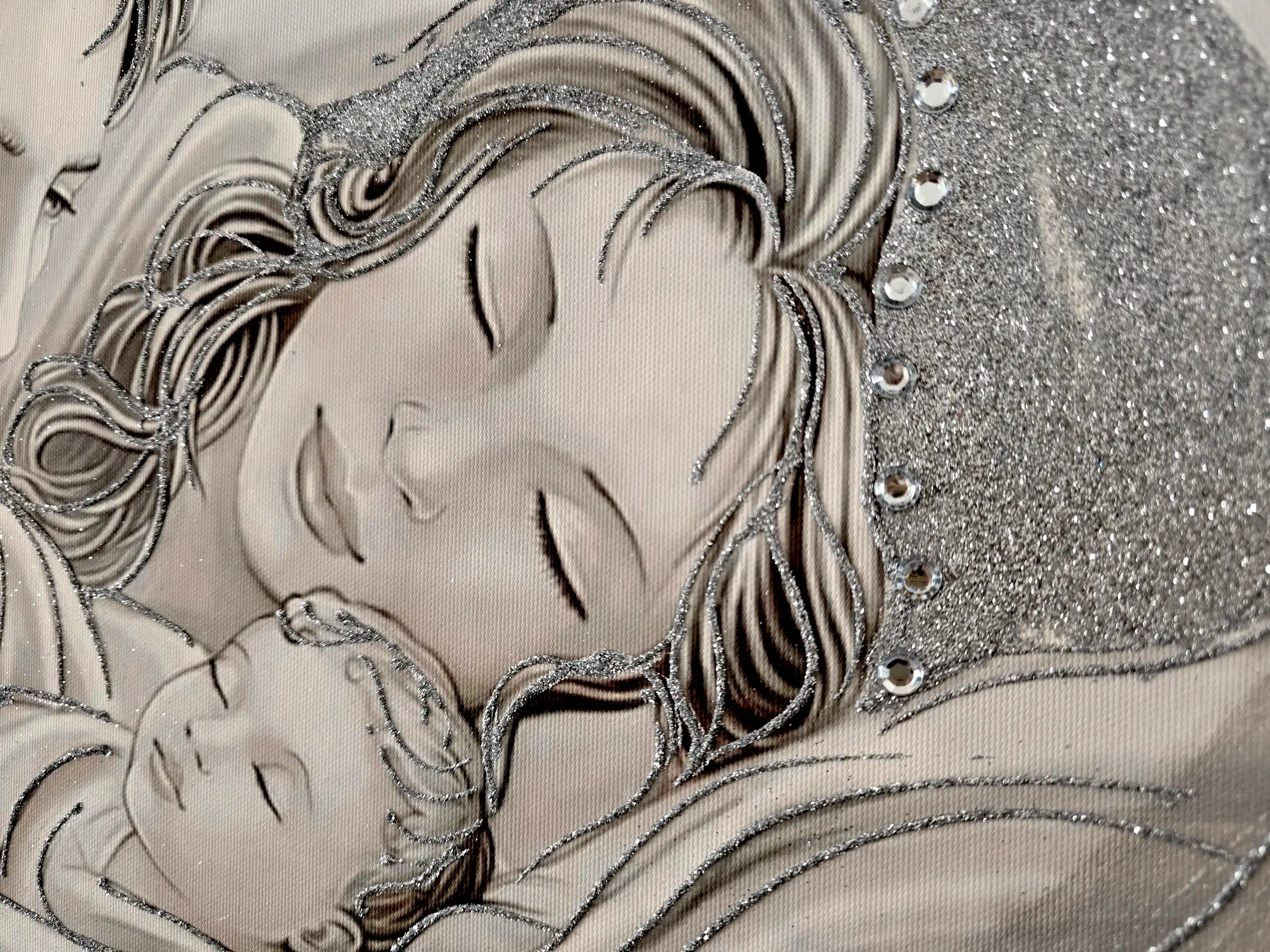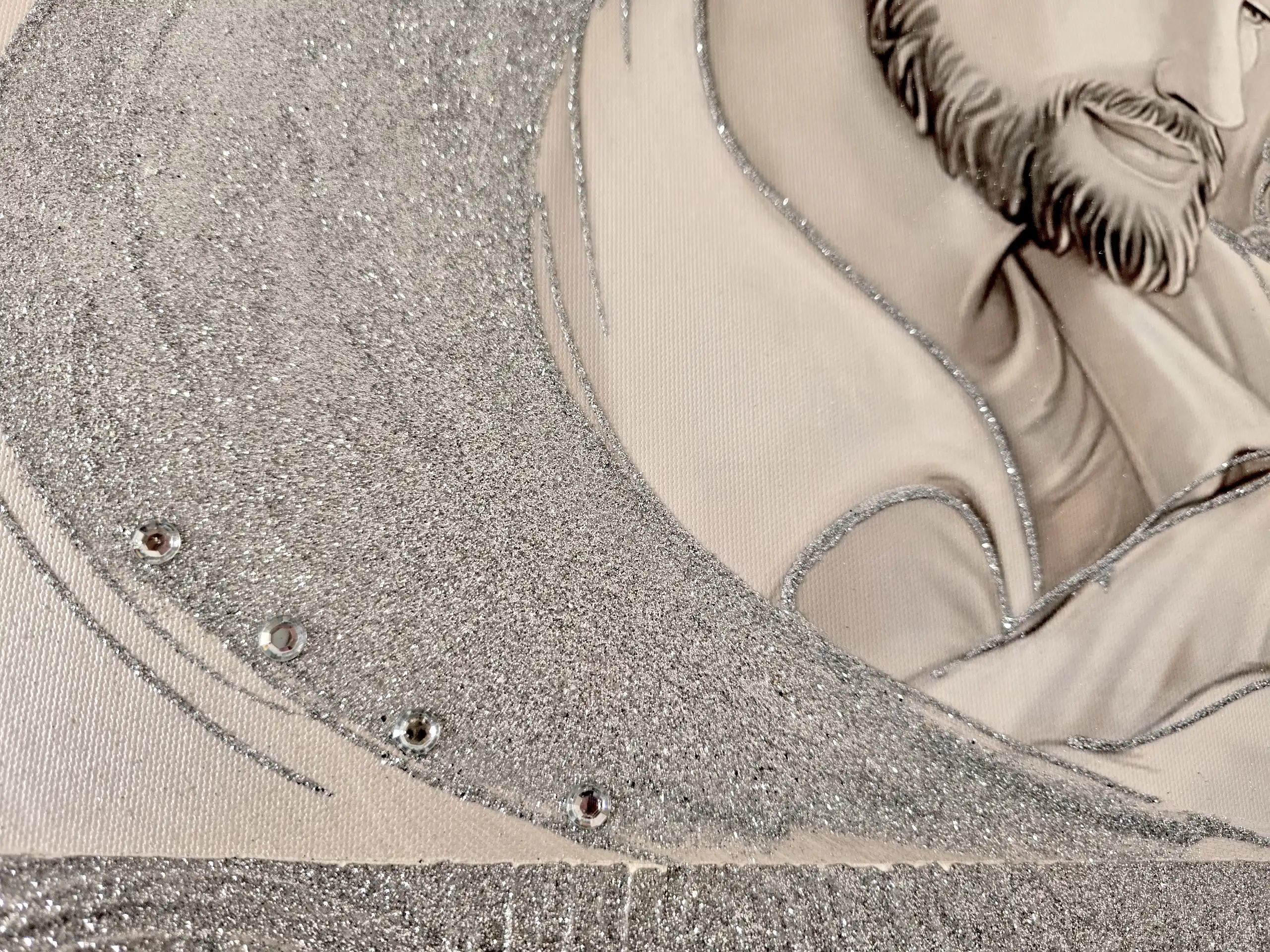 Impreziosito da particolari a rilievo in foglia Argento, Glitter e Strass.