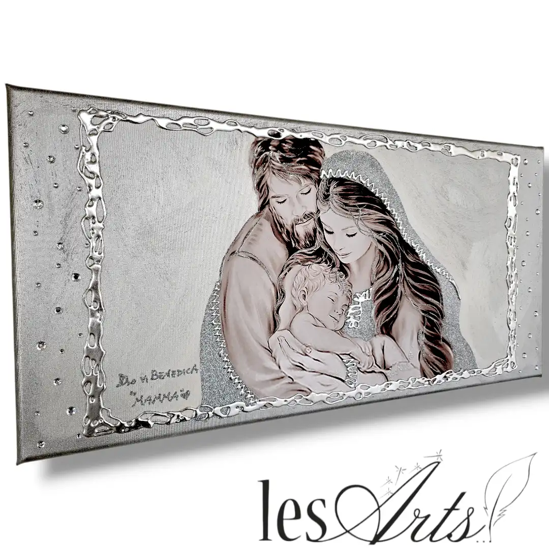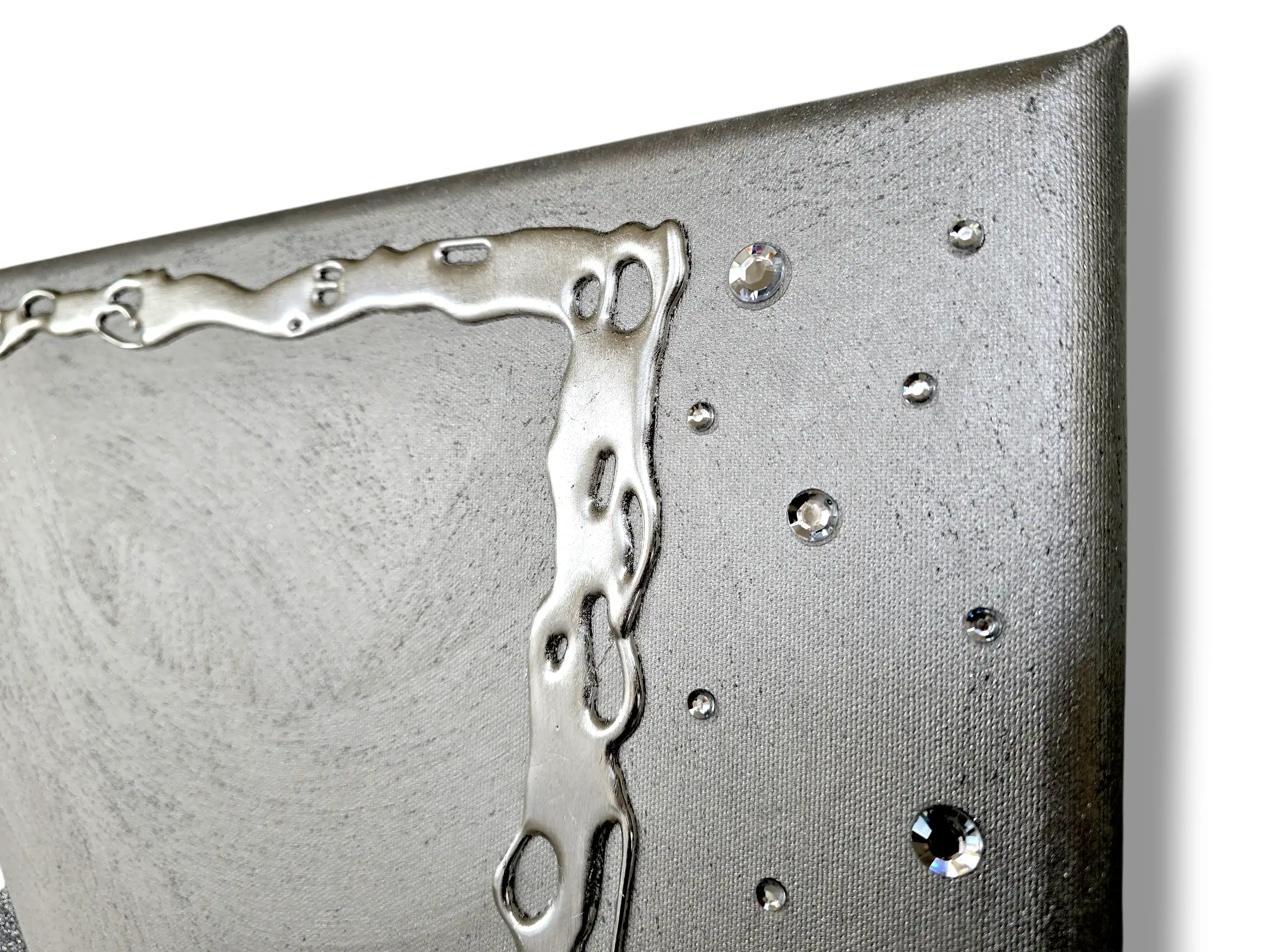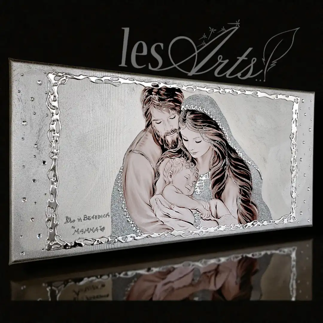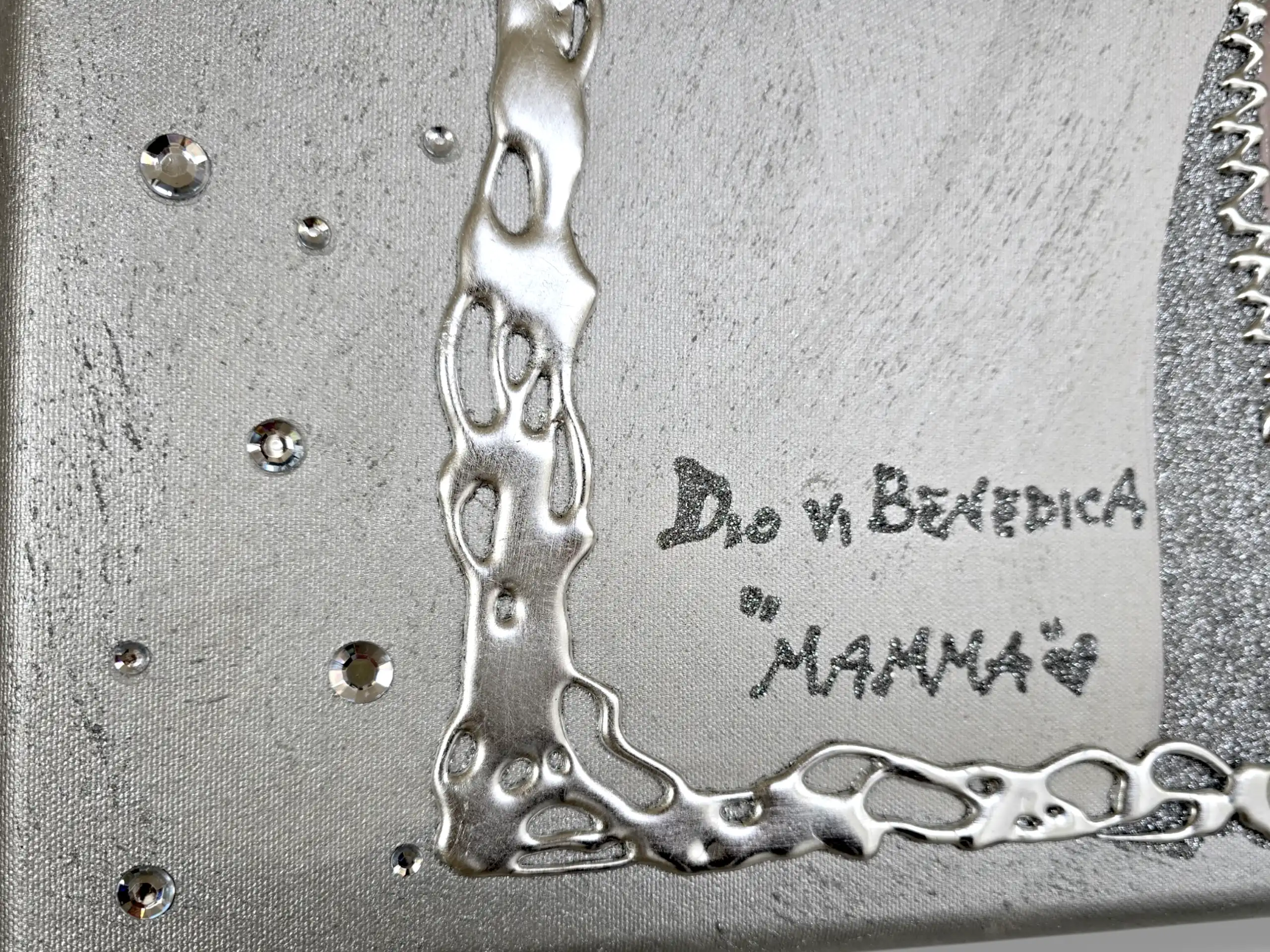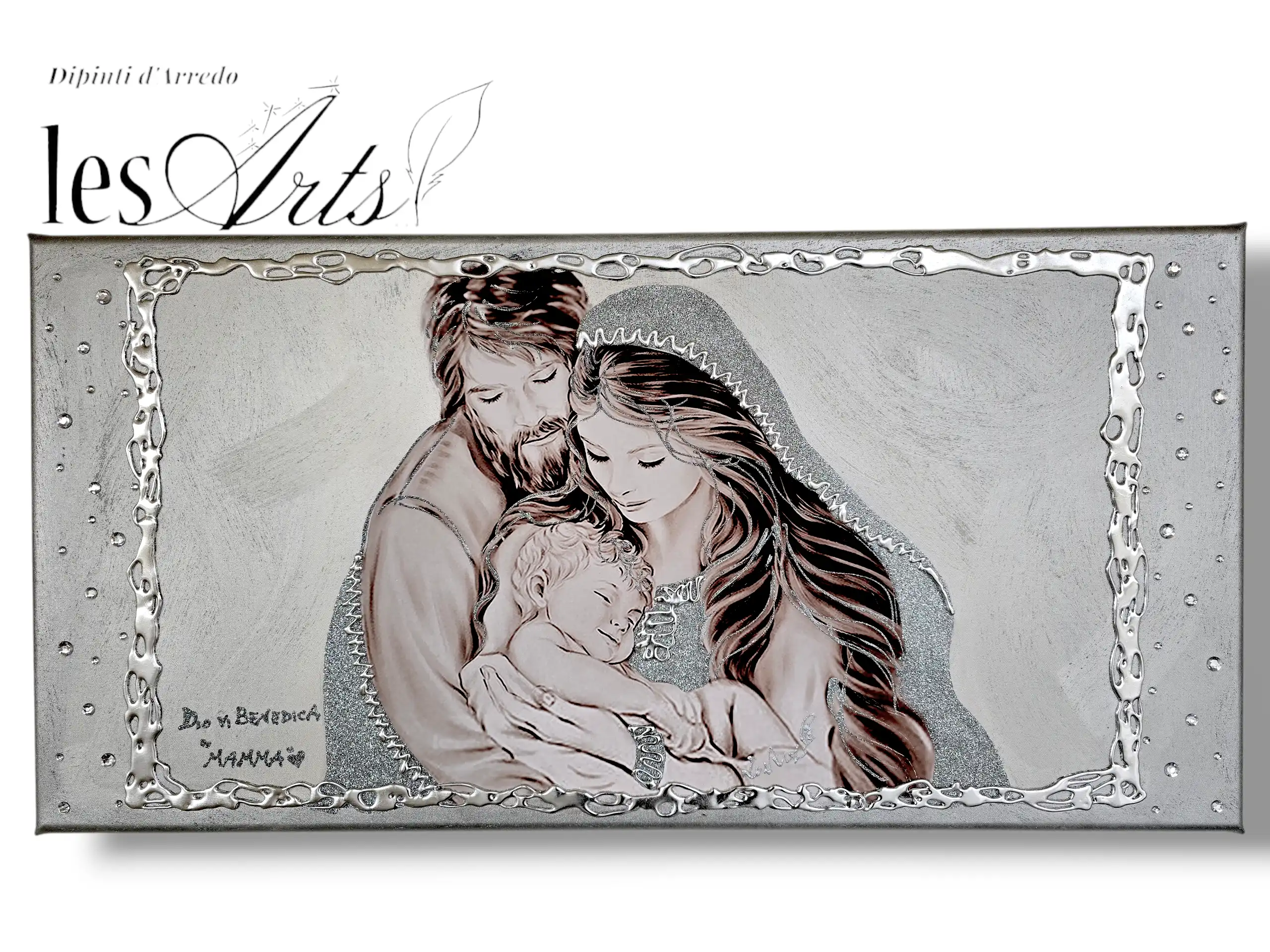 Impreziosito da particolari a rilievo in foglia Argento, Glitter e Strass.