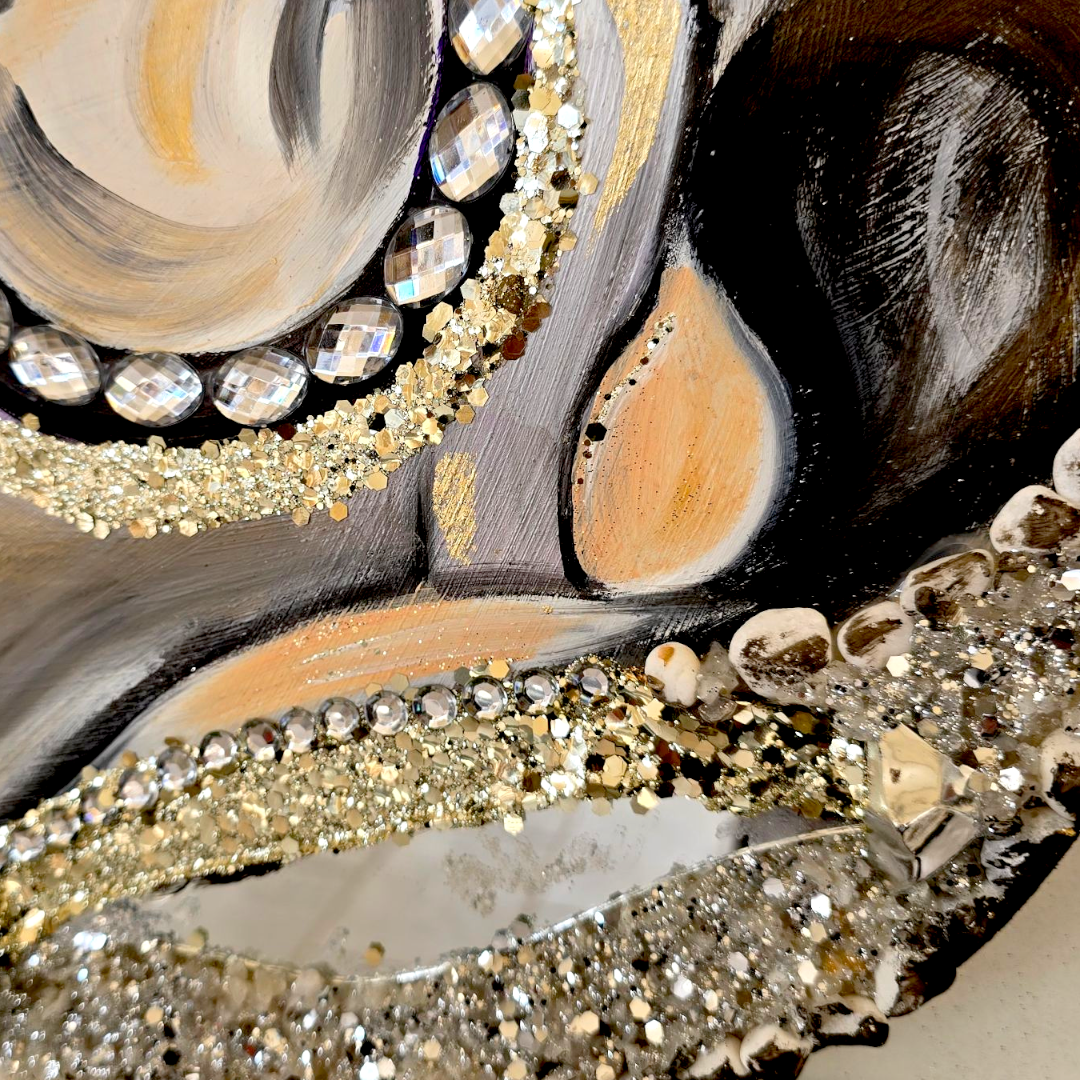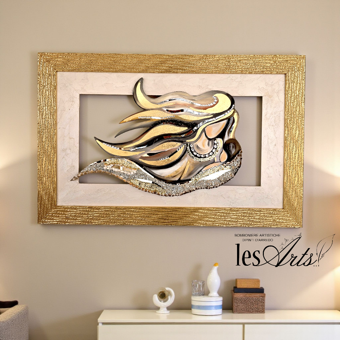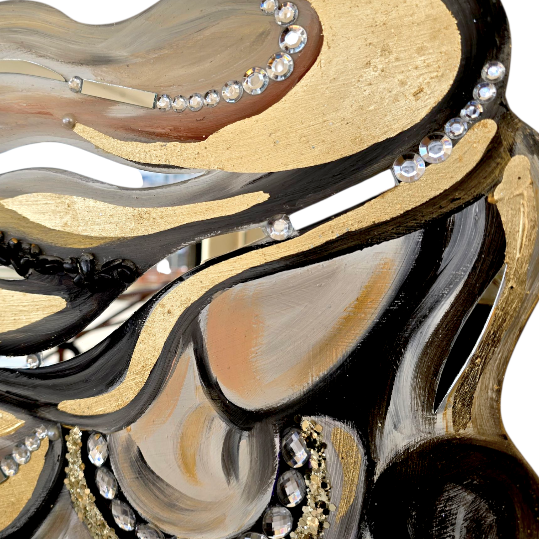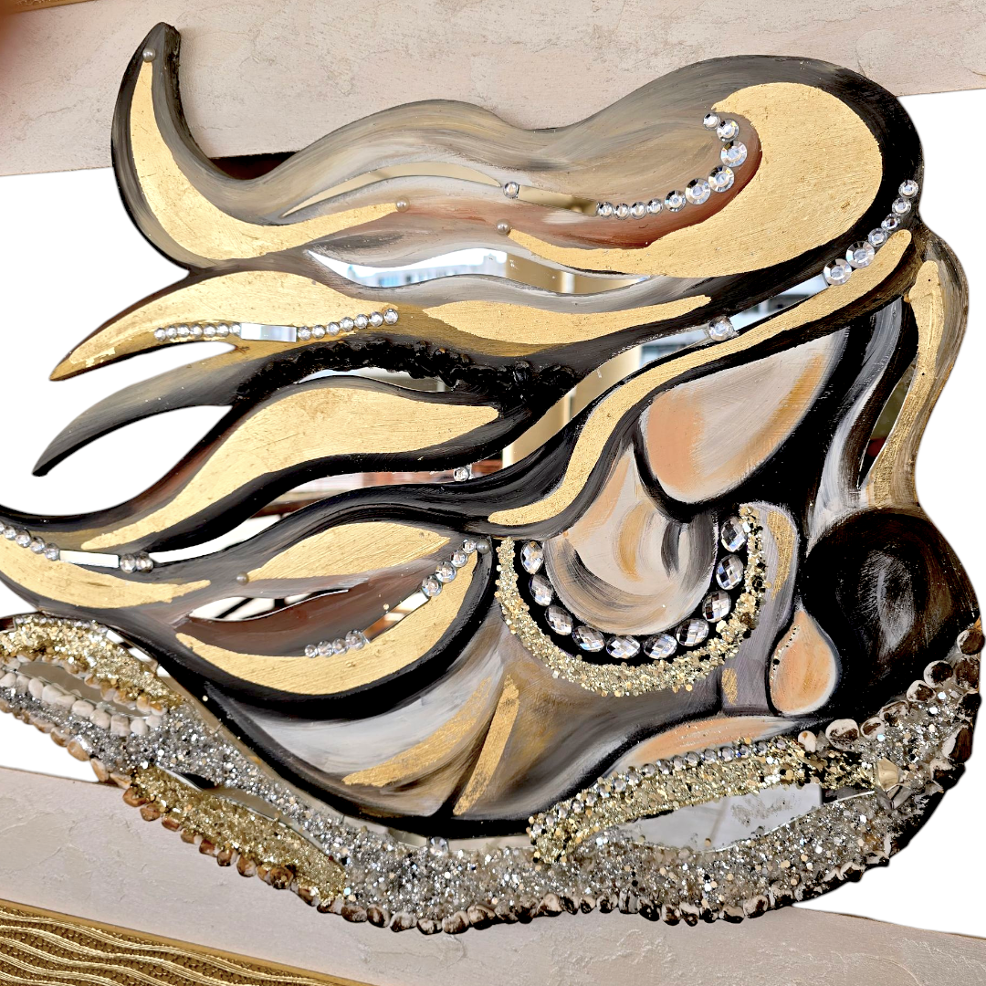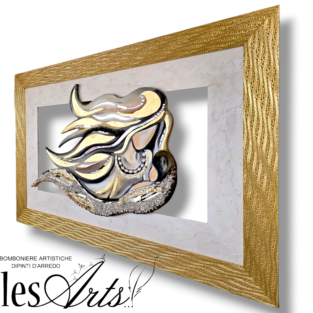 Maternità centrale sagomata a mano su base in legno , dipinta e decorata interamente a mano, impreziosita da particolari a rilievo in pietre decorative glitterate, specchietti, strass e particolari in foglia Oro.