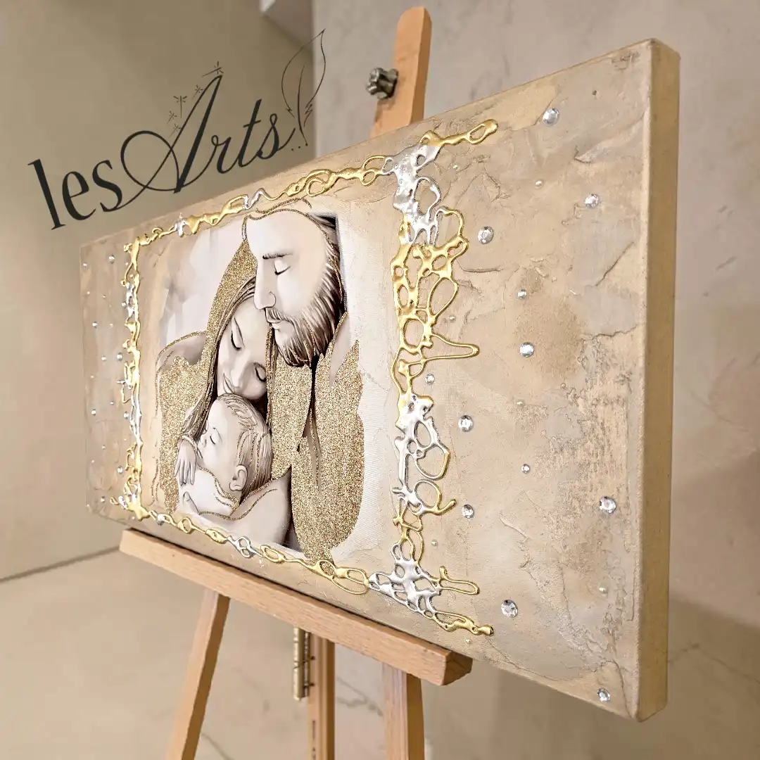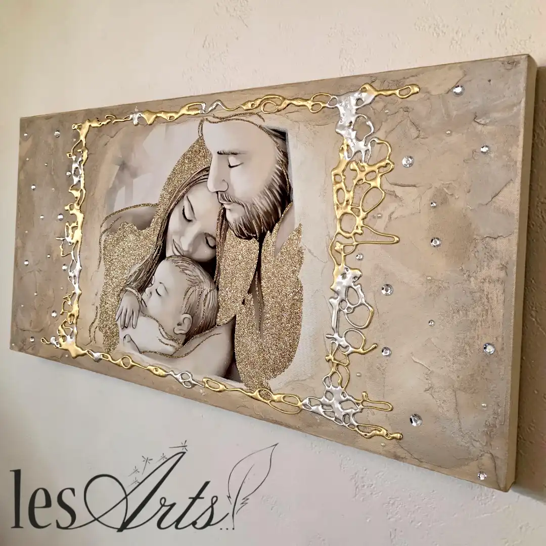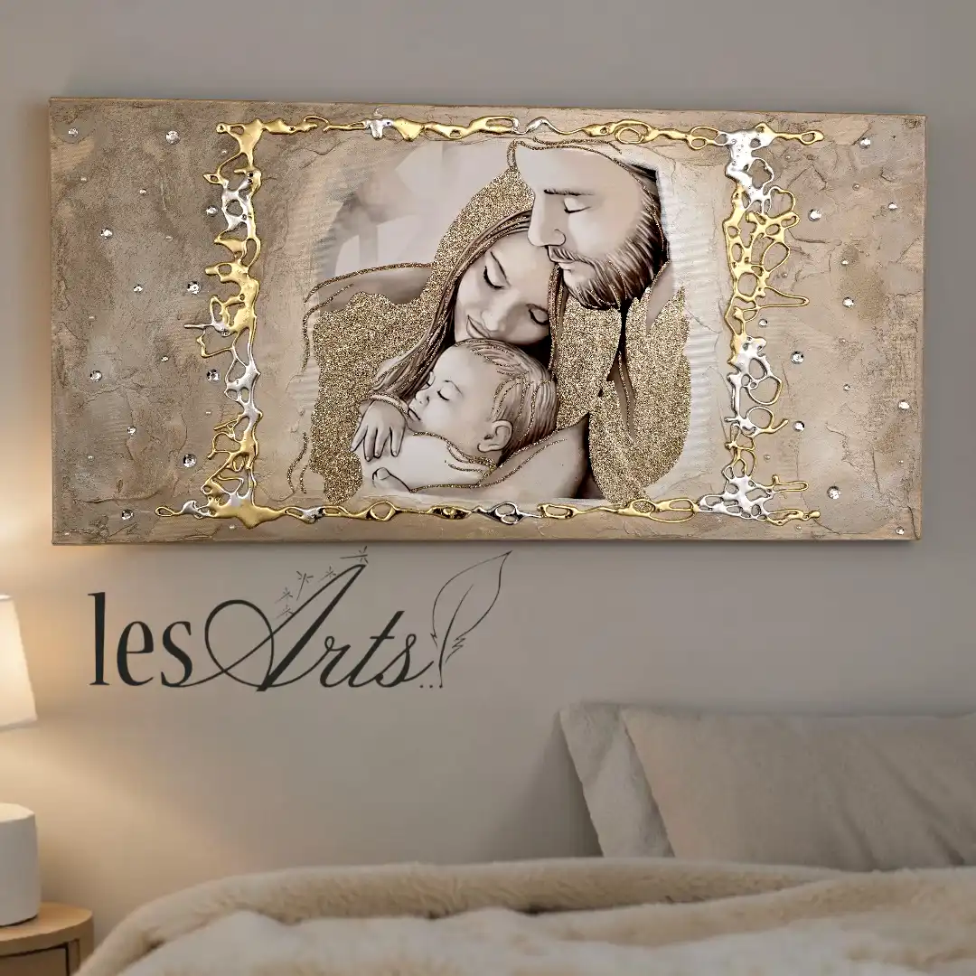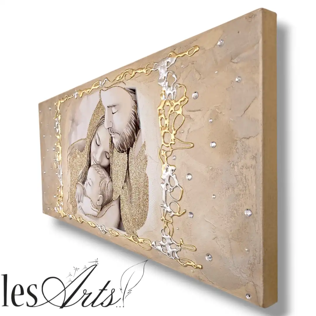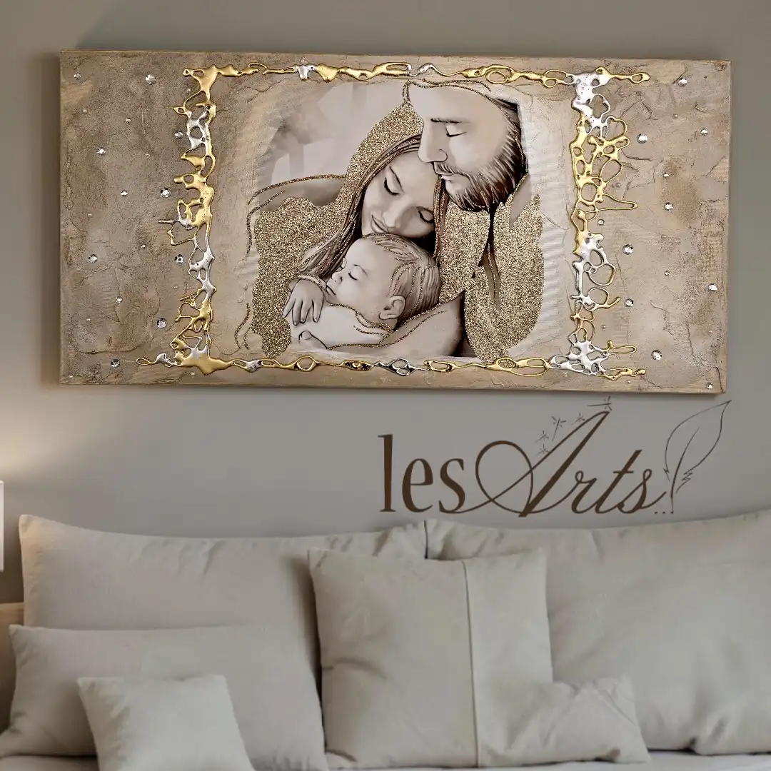 Capezzale D'Arredo realizzato su tela gallery multi-materica, realizzato , dipinto e Decorato a mano Artigianalmente. Impreziosito da particolari a rilievo in foglia oro e argento, Glitter e Strass. I dipinti Les Arts sono realizzati mediante la scelta di materiali di altissima qualità e sono già pronti da appendere e fornite di attaccaglie per la posa in opera. Prodotto 100% made in italy Dimensioni tela gallery: cm 80x40. Personalizzabile con Nomi e/o data. Tempi di realizzazione 10 giorni lavorativi circa dal momento dell'ordine Per maggiori informazioni WhatsApp 328-9210448