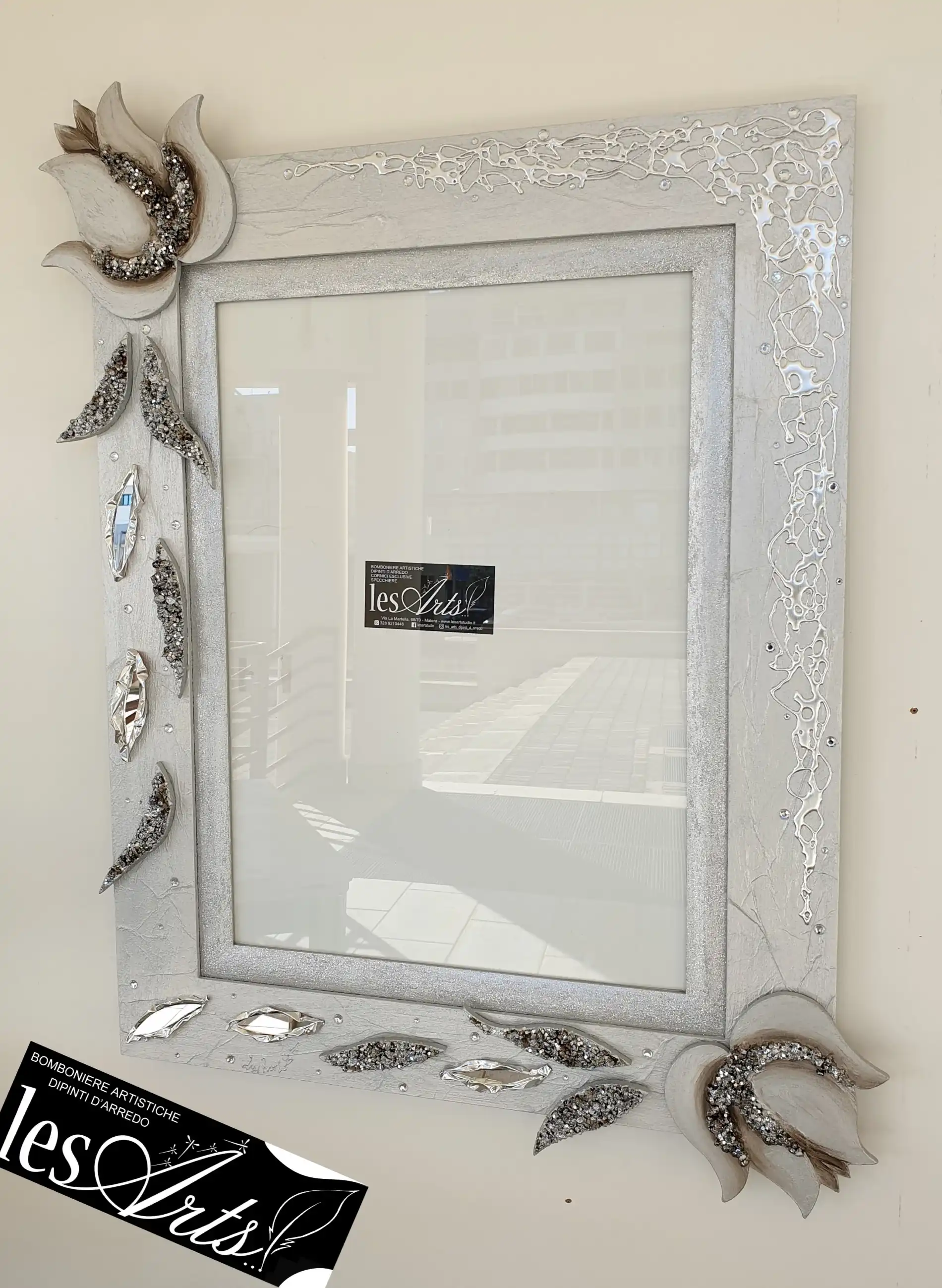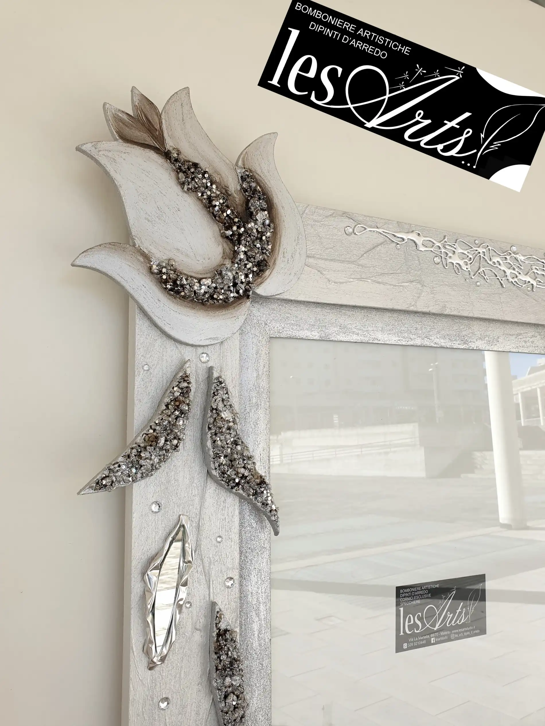 Impreziosita da inserti in legno arricchiti da pietre decorative..particolari in foglia argento e strass.