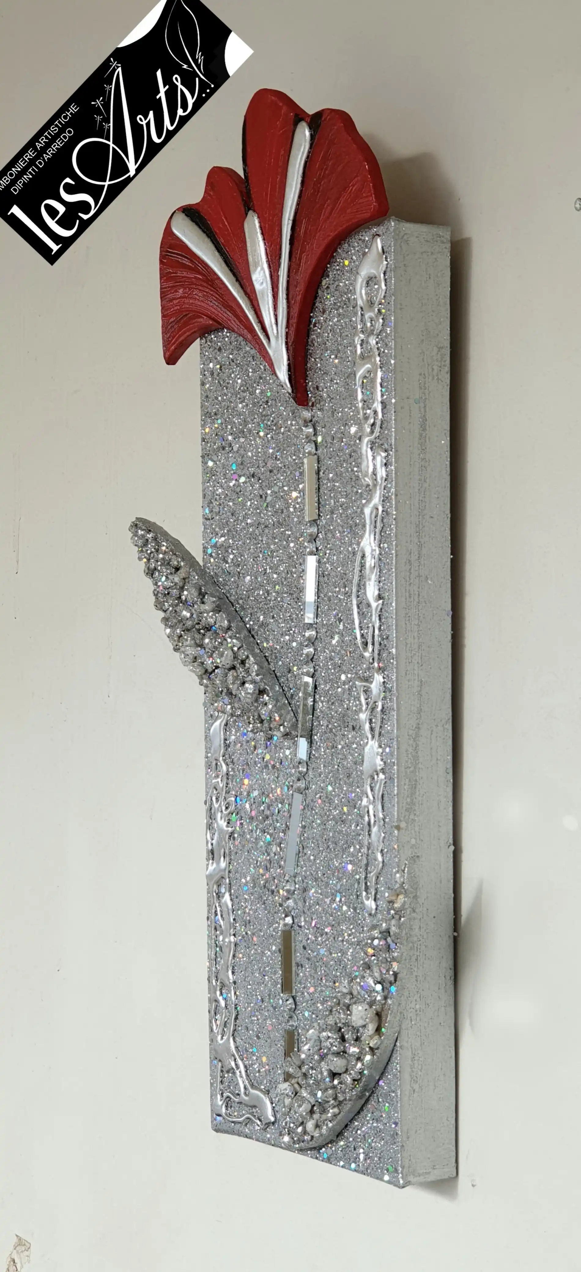 Impreziosito da inserti in legno arricchiti da pietre decorative e particolari in foglia argento..specchietti e strass.