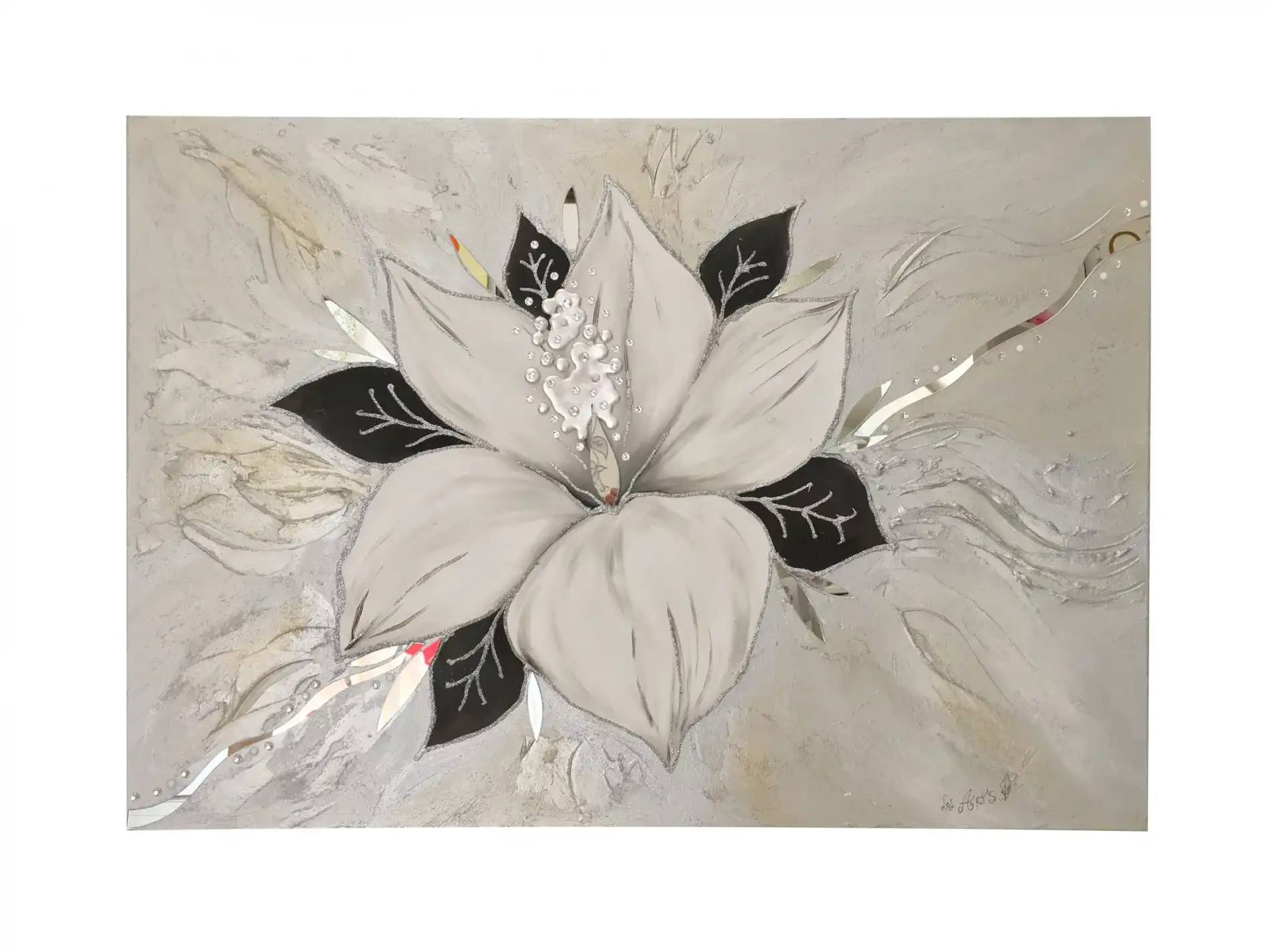 Impreziosito da inserti materici, decori in foglia argento..glitter, strass e particolari di specchi.