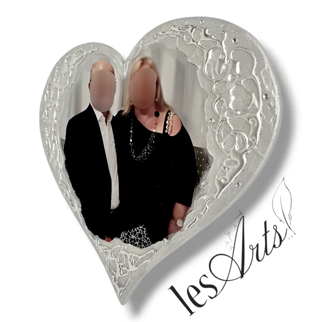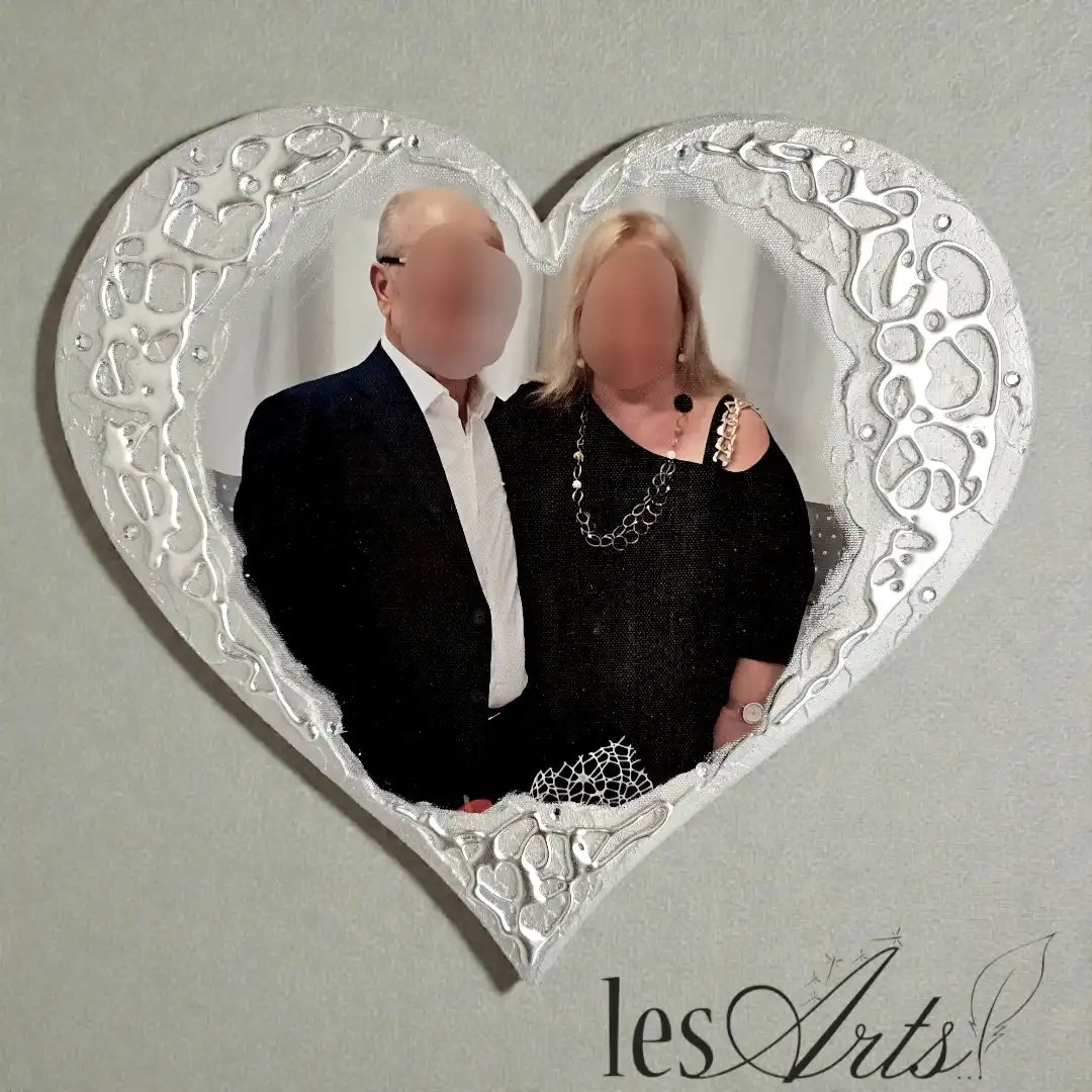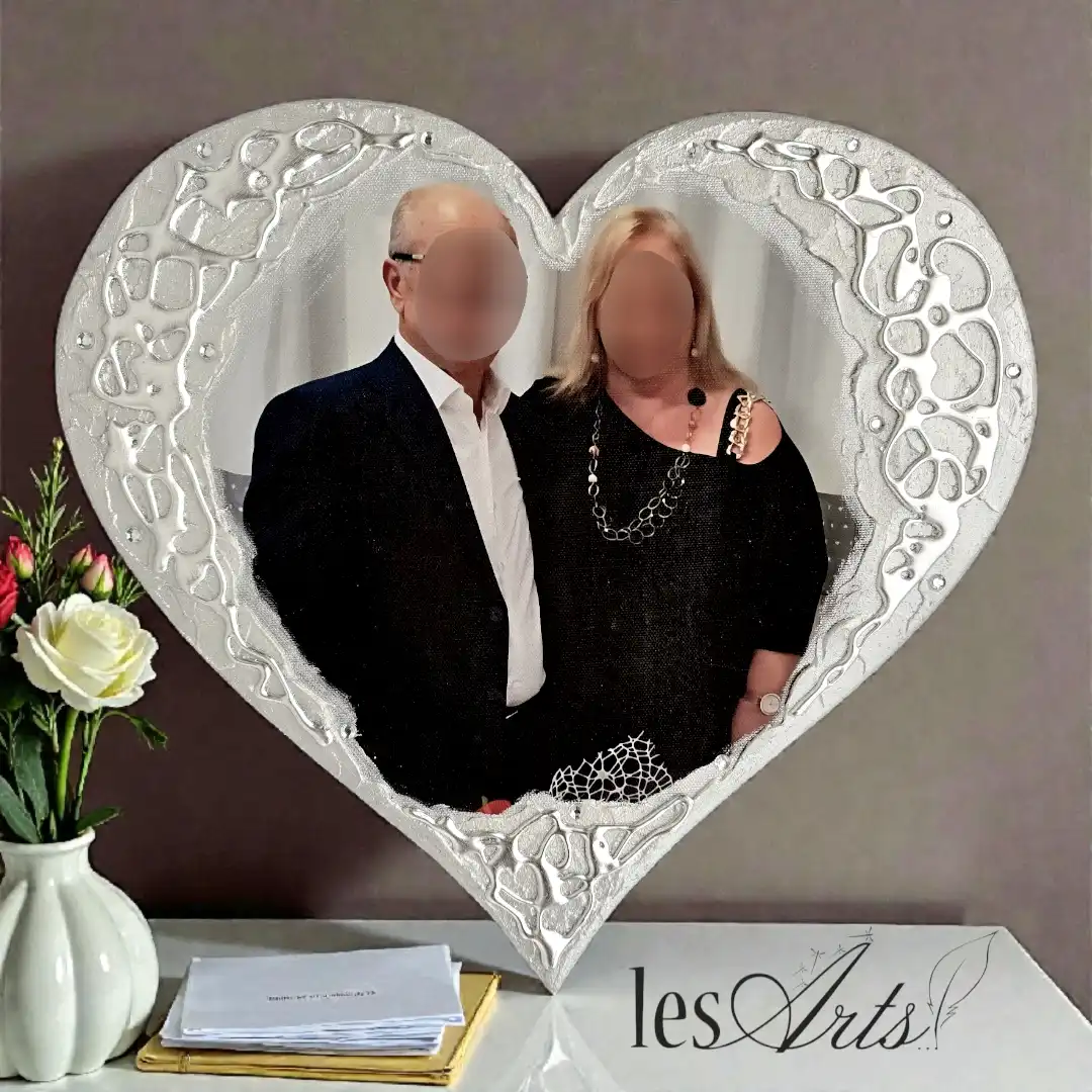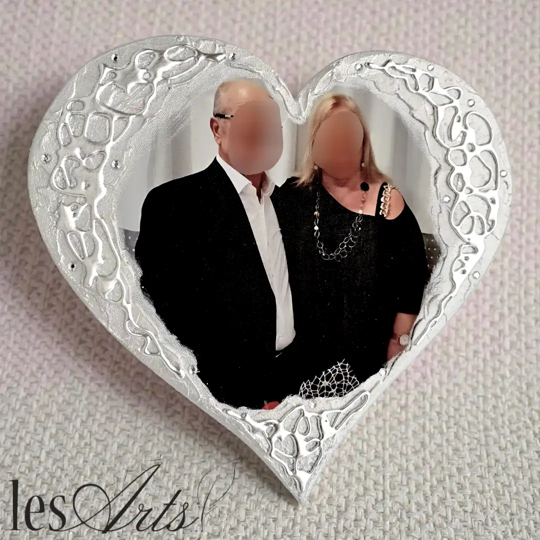 Foto stampata su tela, applicata su pannello sagomato a forma di Cuore. Interamente realizzato, dipinto e Decorato a mano Artigianalmente. Misura : cm 30x30.