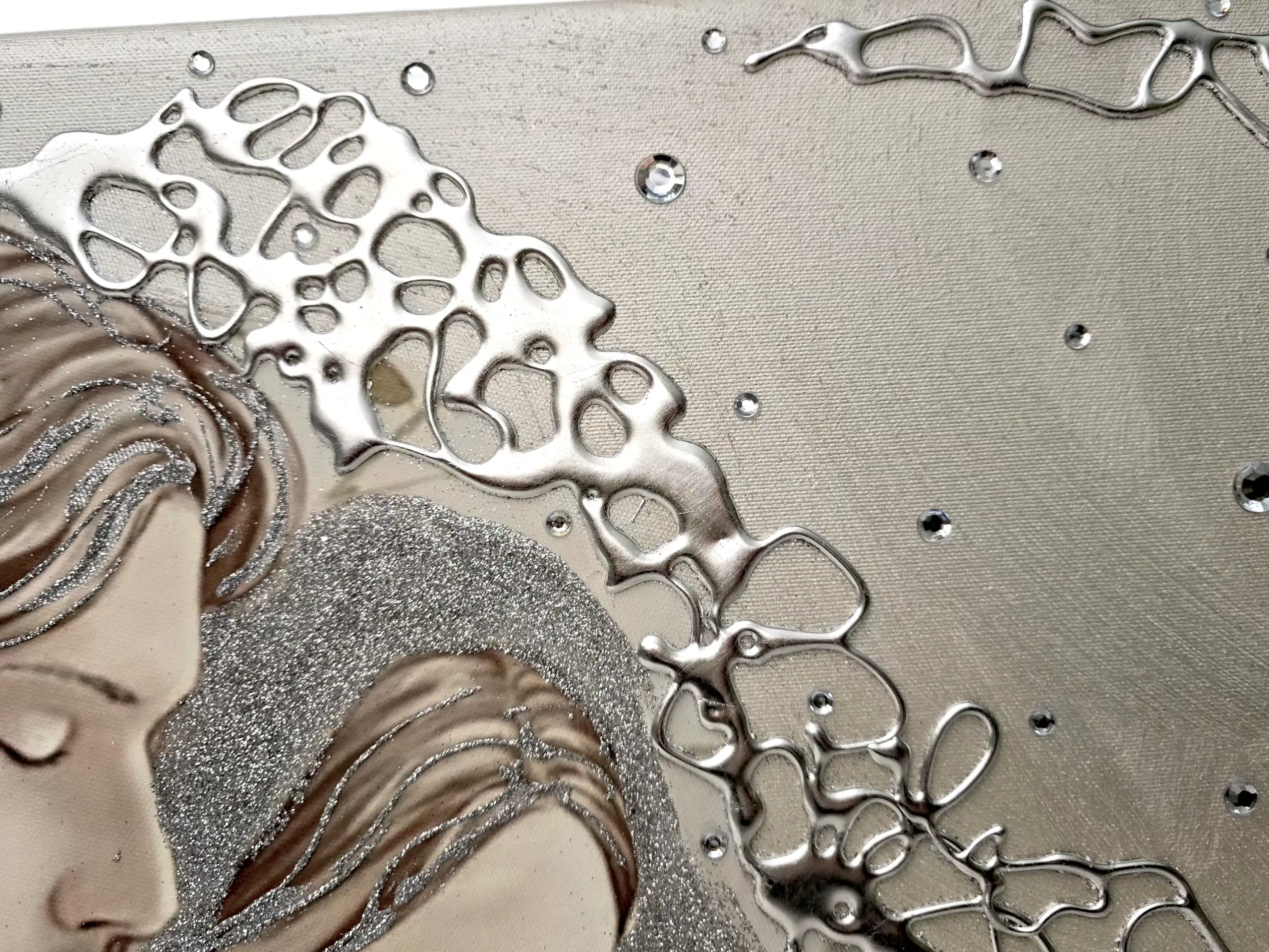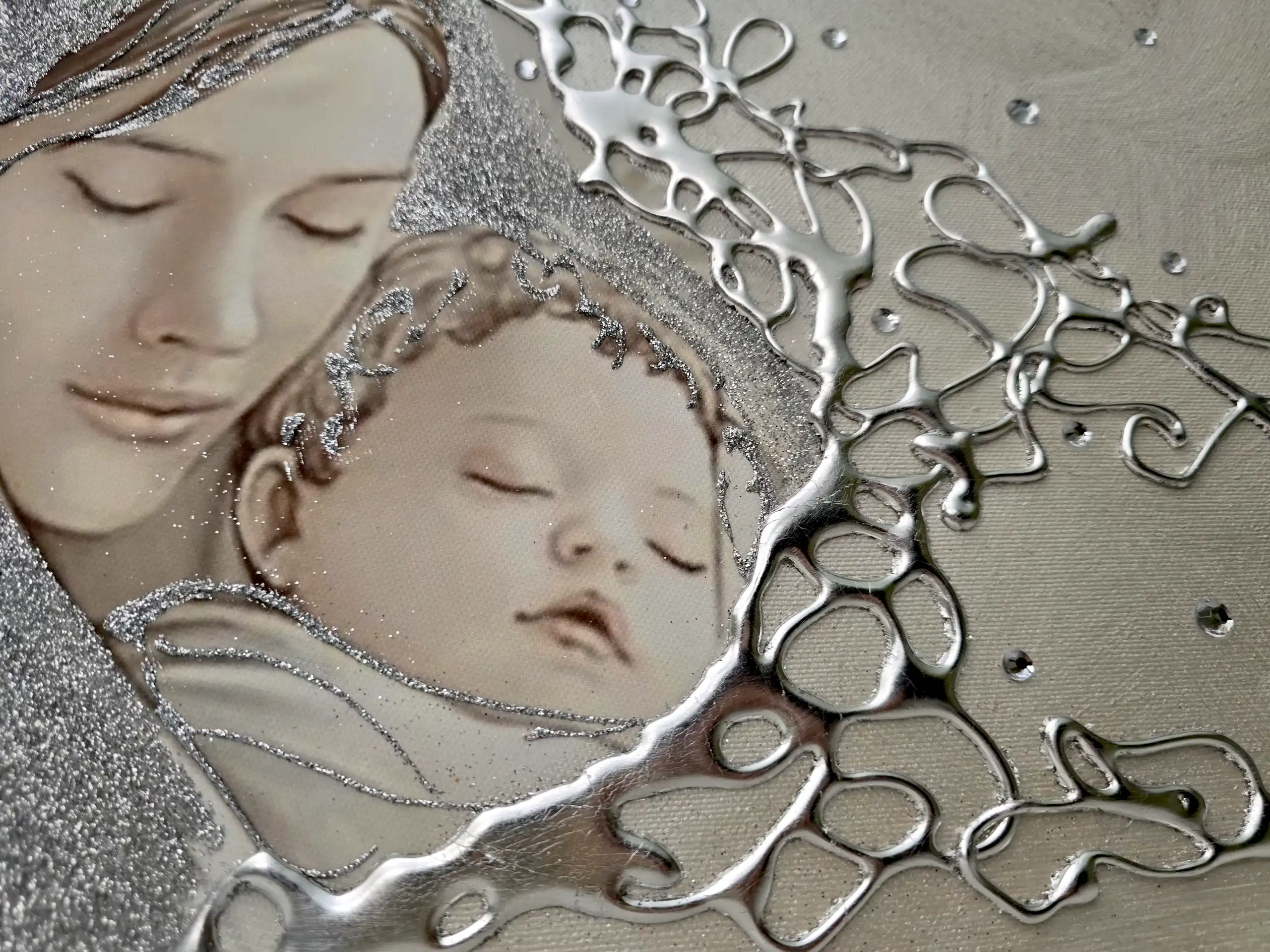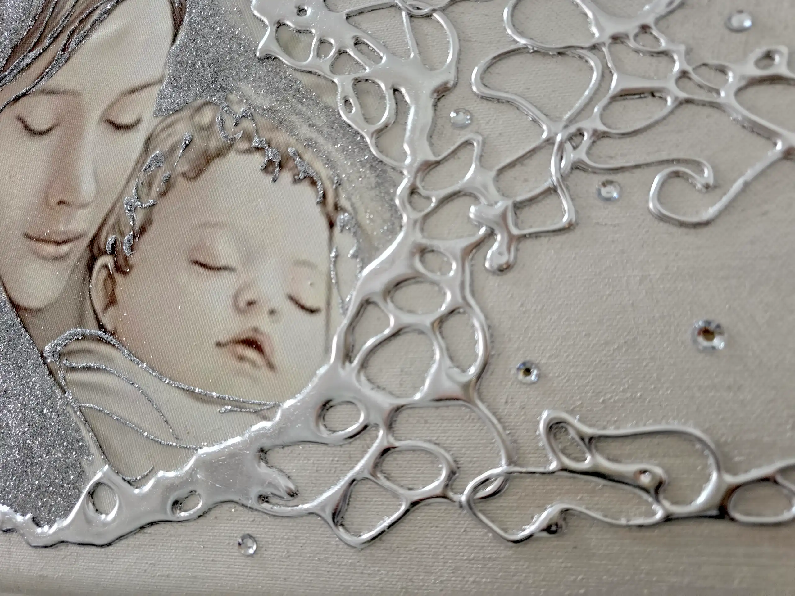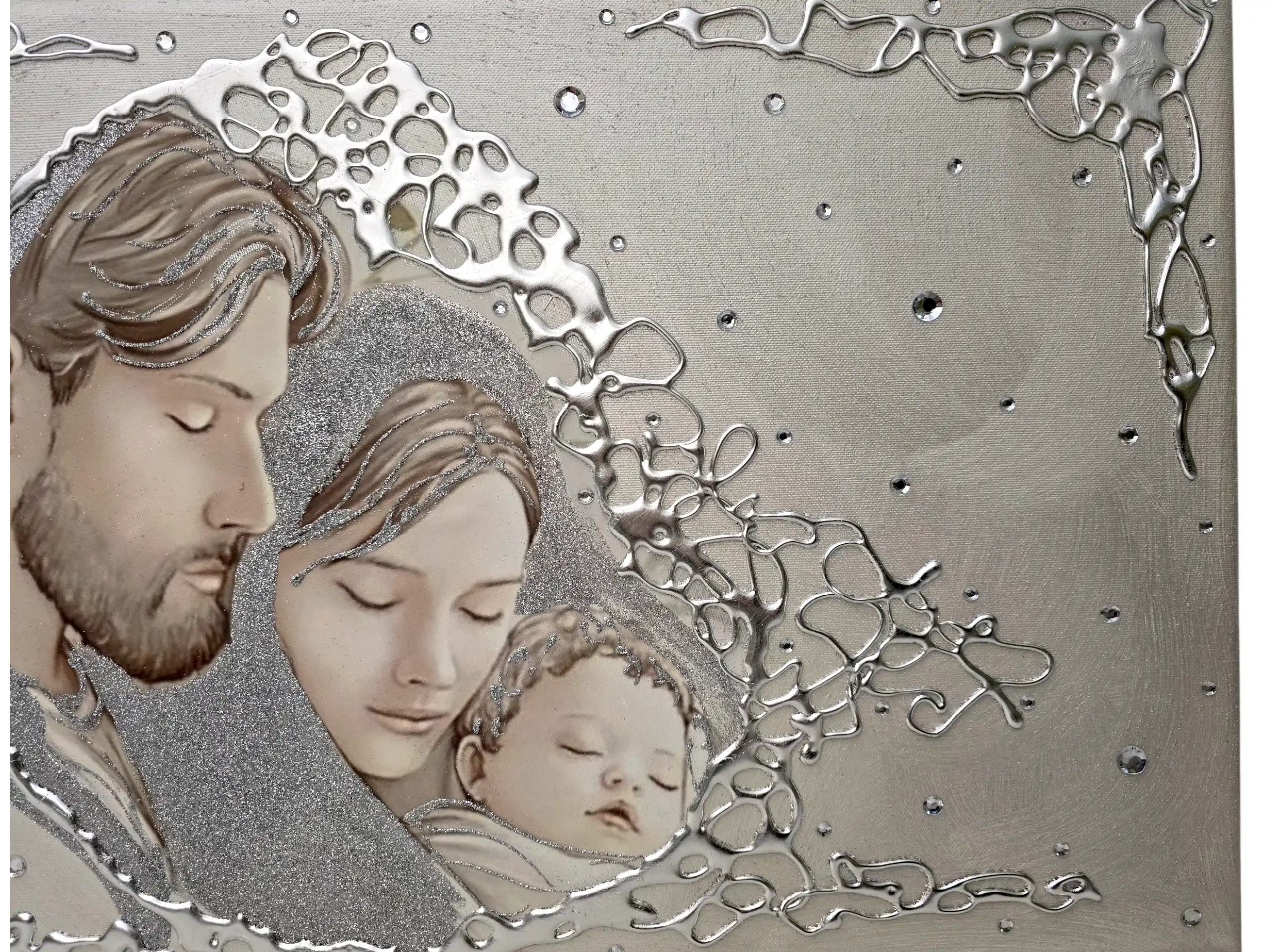 Capezzale D'Arredo realizzato su tela gallery multi-materica, realizzato , dipinto e Decorato a mano Artigianalmente. Impreziosito da particolari a rilievo in foglia Argento, Glitter e Strass. I dipinti Les Arts sono realizzati mediante la scelta di materiali di altissima qualità e sono già pronti da appendere e fornite di attaccaglie per la posa in opera. Prodotto 100% made in italy Dimensioni tela gallery stondata cm : 70X40. Personalizzabile con DEDICA Nomi e/o data. Tempi di realizzazione 10 giorni lavorativi circa dal momento dell'ordine Per maggiori informazioni WhatsApp 328-9210448