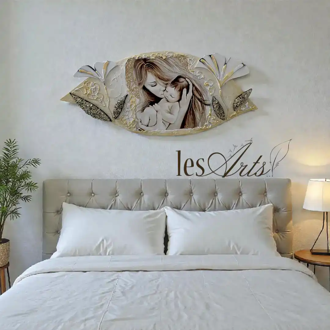 Maternità fiori Capezzale D'Arredo realizzato su pannello in legno sagomato multi-materico, realizzato , dipinto e Decorato a mano Artigianalmente. Impreziosito da inserti in legno arricchiti da pietre decorative glitterate, particolari a rilievo in foglia Argento e Glitter. I dipinti Les Arts sono realizzati mediante la scelta di materiali di altissima qualità e sono già pronti da appendere e fornite di attaccaglie per la posa in opera. Prodotto 100% made in italy Dimensioni : cm 110x55 circa . Tempi di realizzazione 10/15 giorni lavorativi circa dal momento dell'ordine Per maggiori informazioni WhatsApp 328-9210448