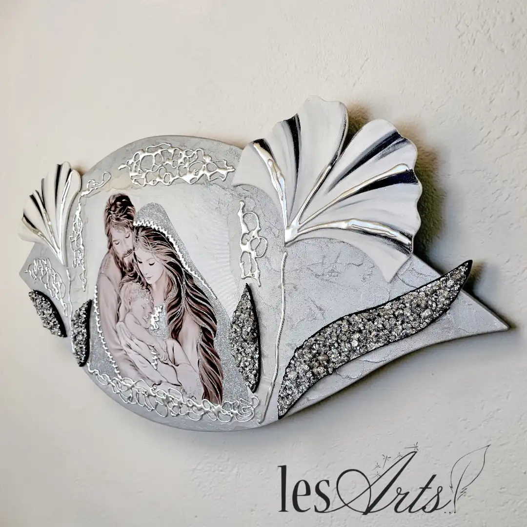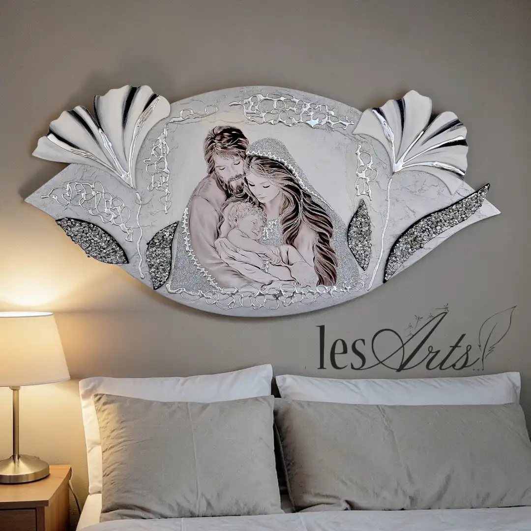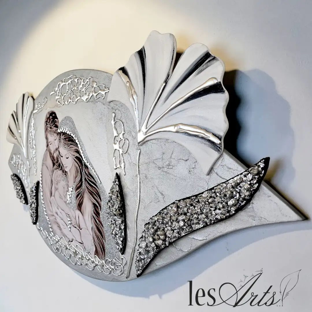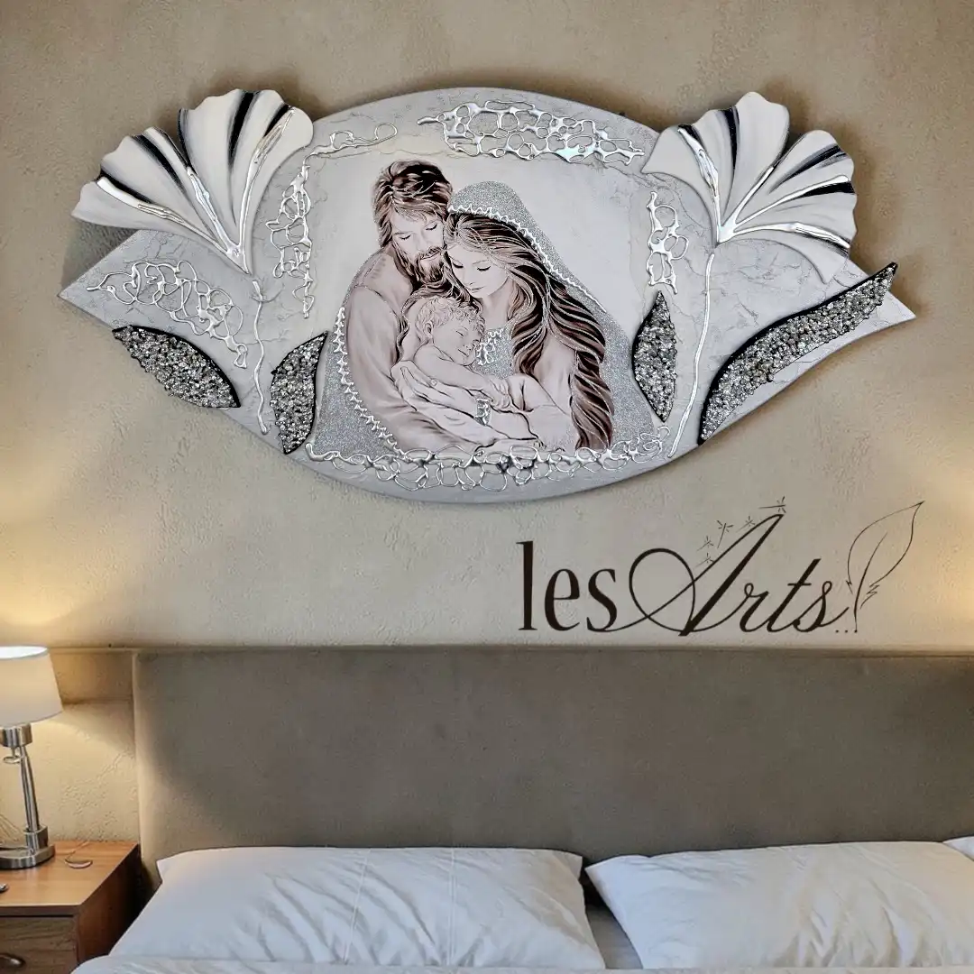 Maternità fiori Capezzale D'Arredo realizzato su pannello in legno sagomato multi-materico, realizzato , dipinto e Decorato a mano Artigianalmente. Impreziosito da inserti in legno arricchiti da pietre decorative glitterate, particolari a rilievo in foglia Argento e Glitter. I dipinti Les Arts sono realizzati mediante la scelta di materiali di altissima qualità e sono già pronti da appendere e fornite di attaccaglie per la posa in opera. Prodotto 100% made in italy Dimensioni : cm 110x55/60 circa . Tempi di realizzazione 10/15 giorni lavorativi circa dal momento dell'ordine Per maggiori informazioni WhatsApp 328-9210448