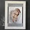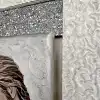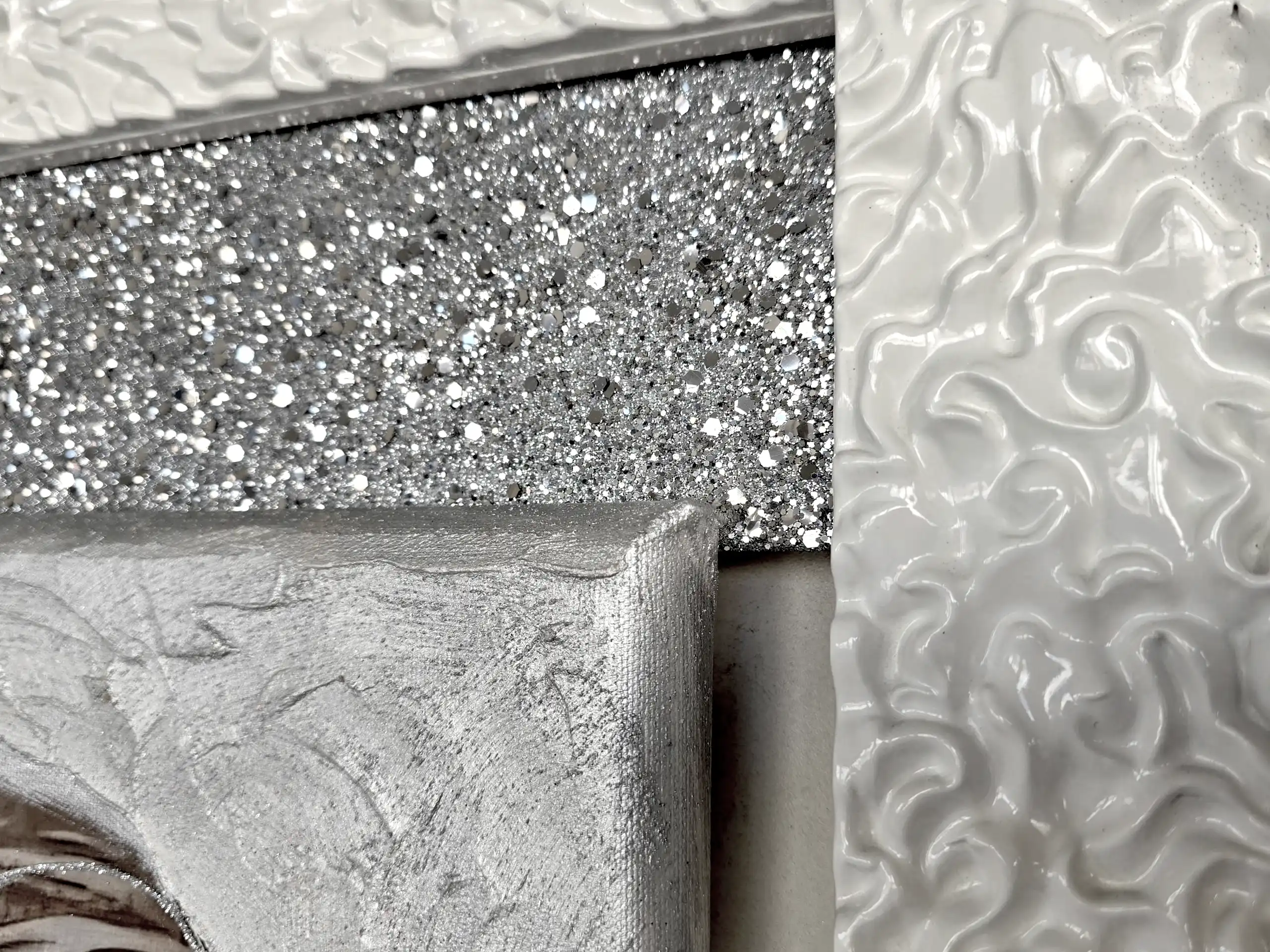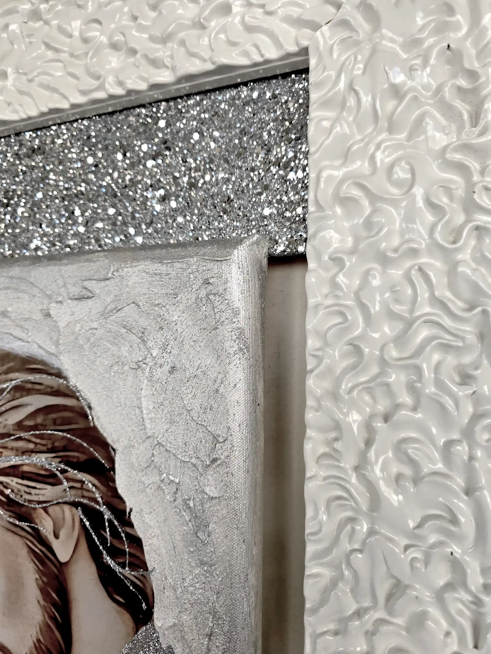 La tela è completa di Cornice bianca laccata. Con doppia cornice glitterata argento.