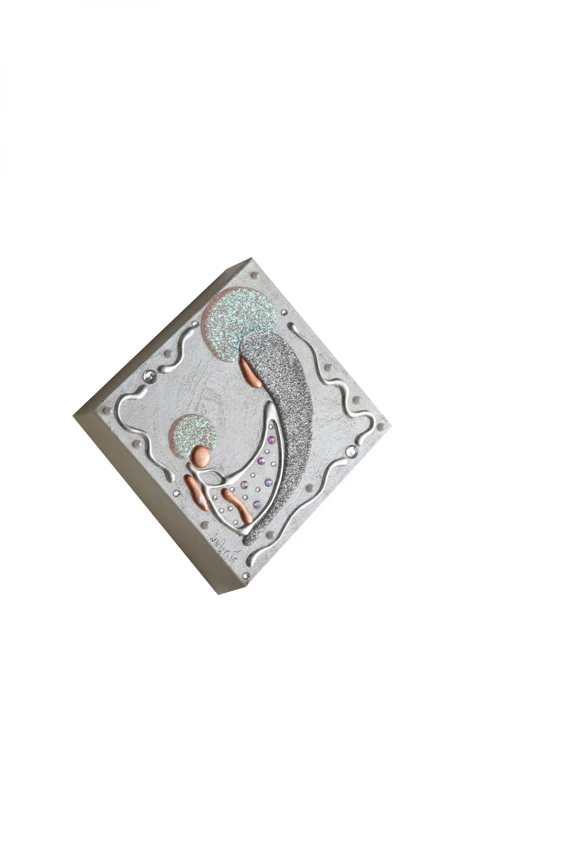 Tela 20x20 interamente realizzata e decorata a mano con decori in foglia argento e foglia rame, glitter, perle e strass.