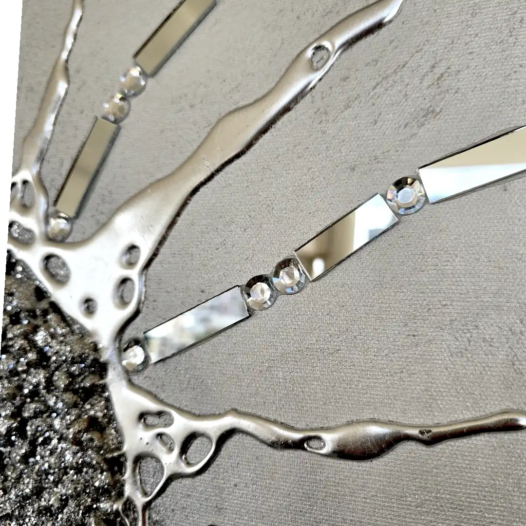 Impreziosito da pietre decorative glitterate, particolari a rilievo in foglia Argento, specchietti e strass.