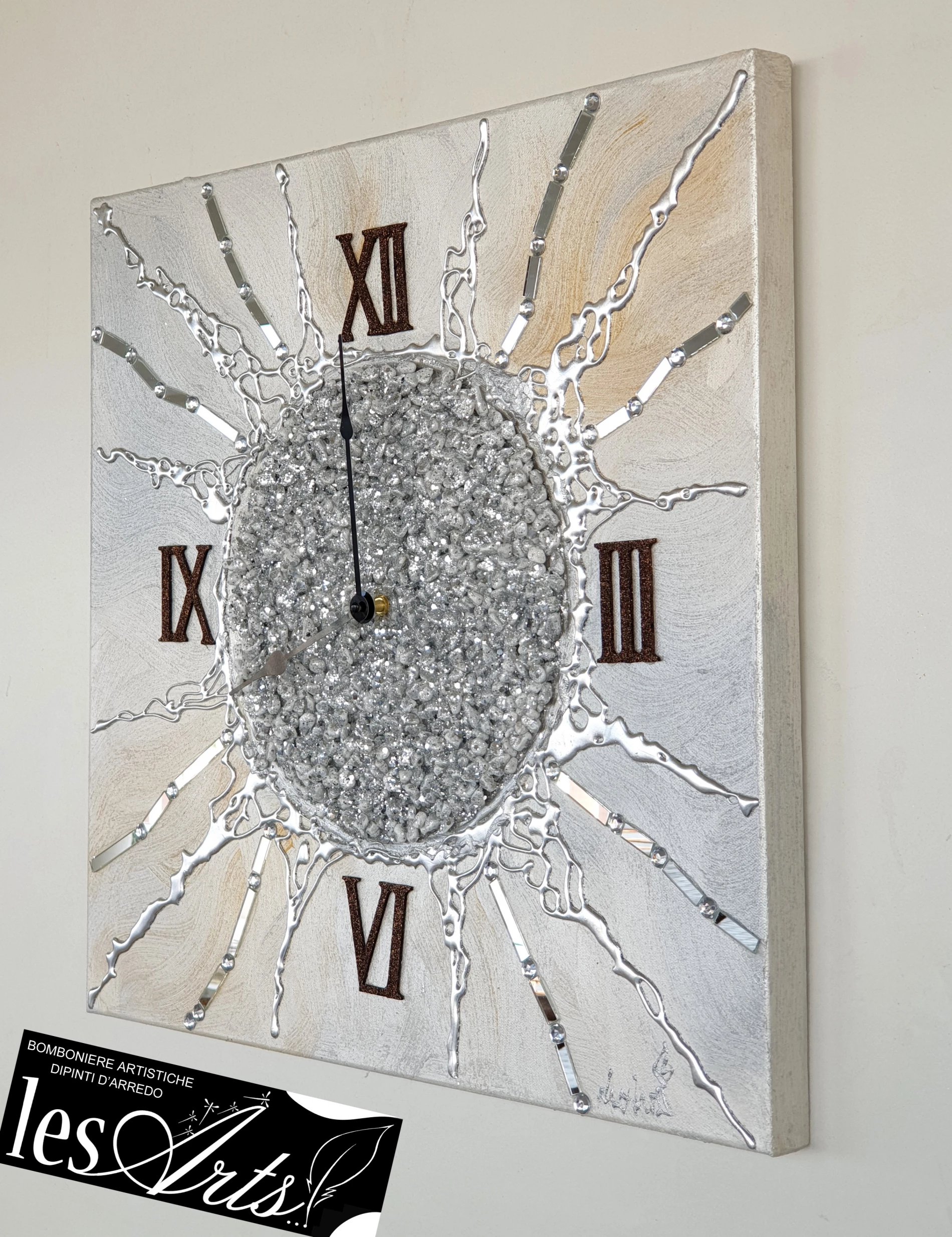 Impreziosito da pietre decorative..particolari in foglia argento, strass, glitter e specchietti.