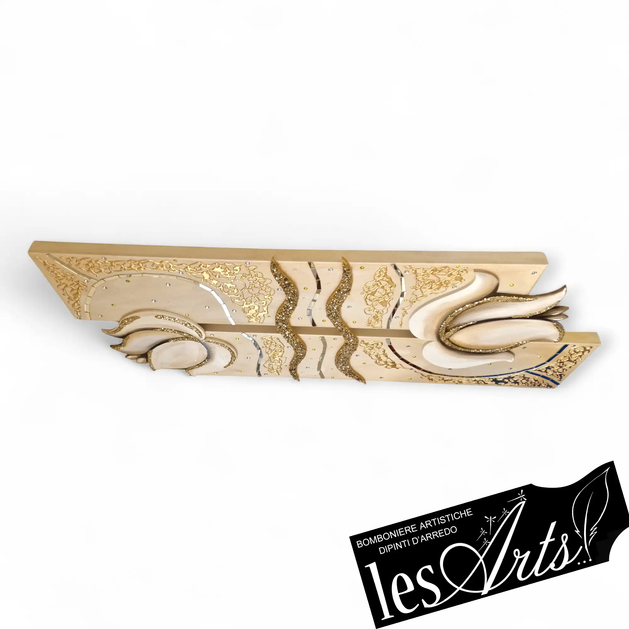 Impreziosito da inserti in legno arricchiti da pietre decorative, particolari a rilievo in foglia oro, glitter ,strass e specchietti.