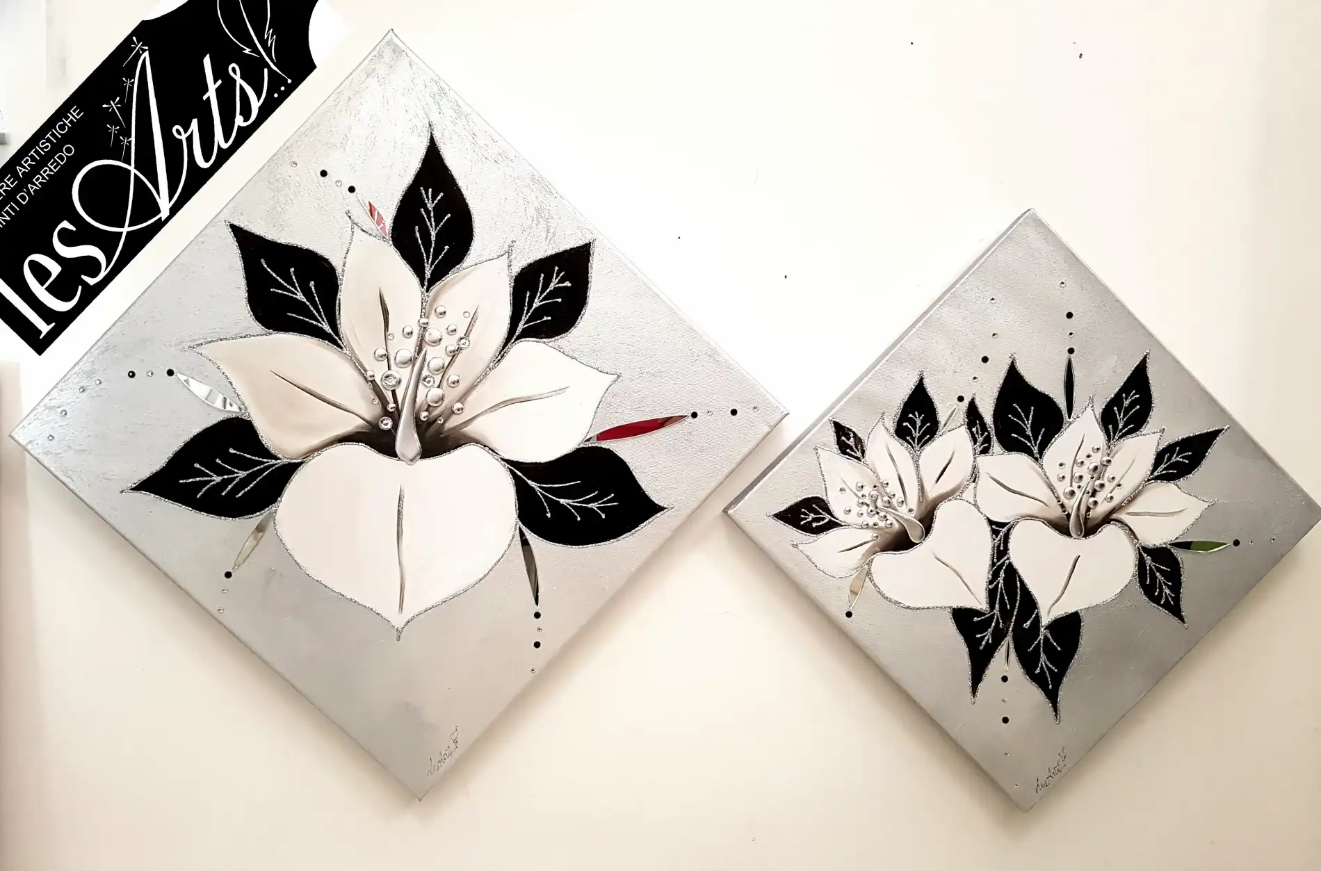 Scomposto caratterizzato da 2 tele 50x50 e 40x40. Interamente realizzate dipinte e decorate a mano. Particolari in foglia argento e strass. Per maggiori informazioni non esitate a contattarci WhatsApp 328-9210448