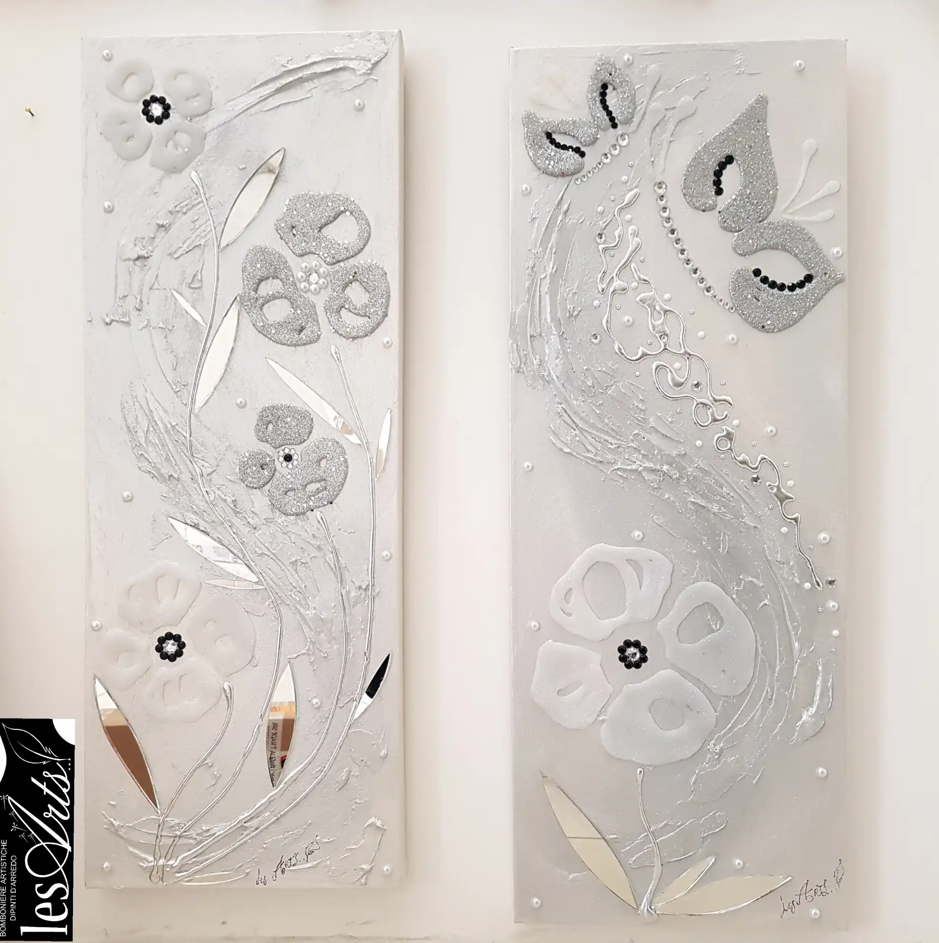 Particolari in foglia argento e strass.