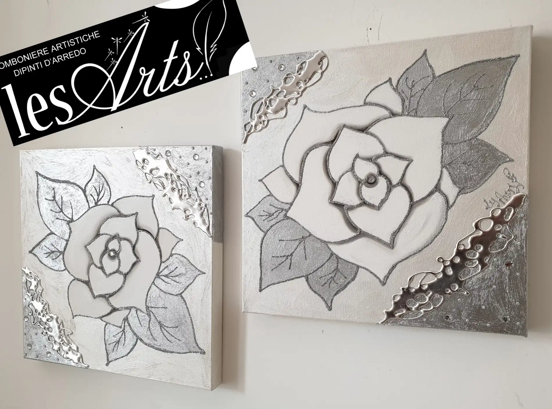 Scomposto caratterizzato da 2 tele gallery misura 40x40 l'una Interamente realizzate dipinte e decorate a mano Particolari in foglia argento e strass Tempi di realizzazione 15 gg lavorativi circa Per maggiori informazioni WhatsApp 328-9210448