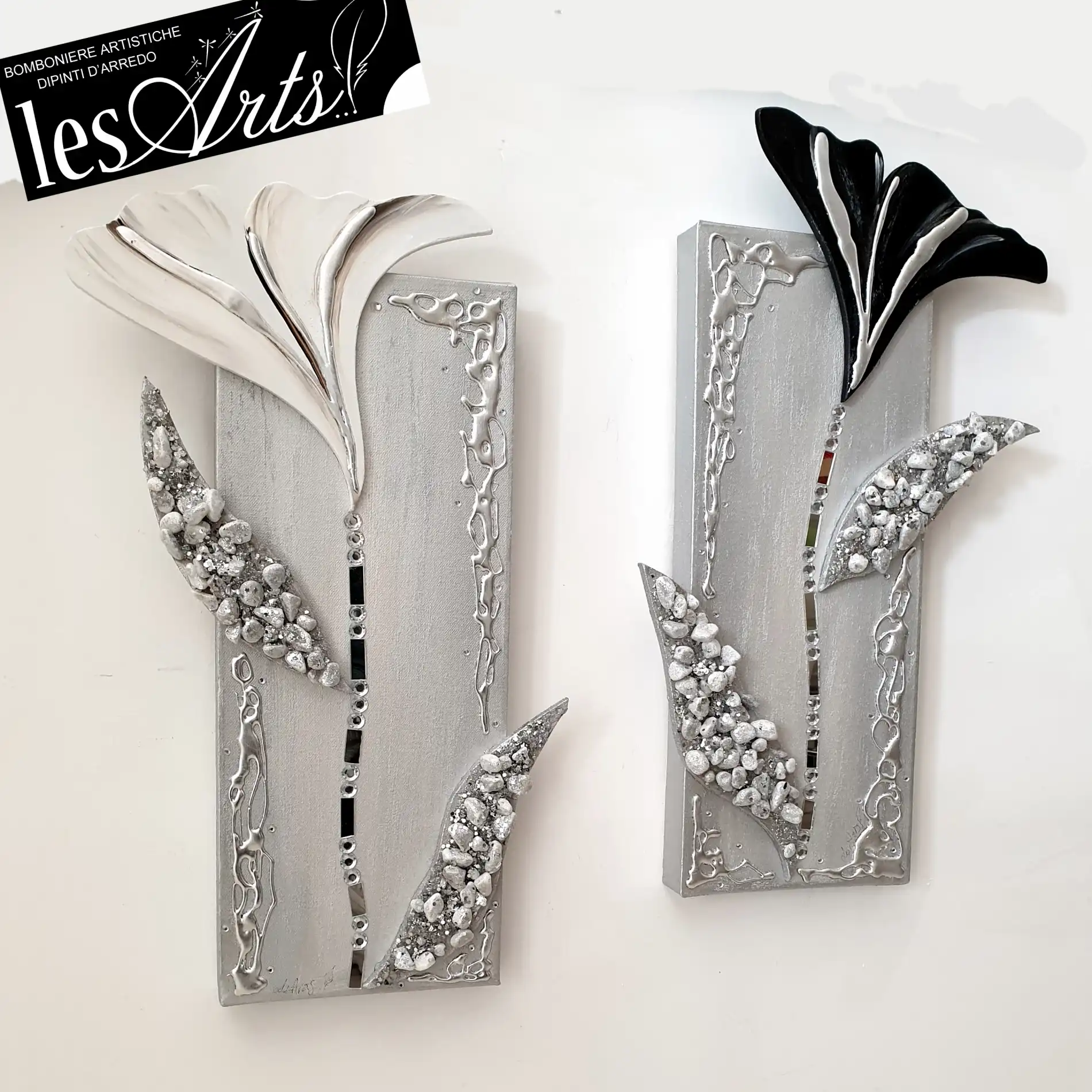 Scomposto caratterizzato da 2 tele gallery misura 20x50 l'una Decorate da inserti in legno.. particolari in foglia argento e strass Tempi di realizzazione 15 gg lavorativi circa Per maggiori informazioni WhatsApp 328-9210448