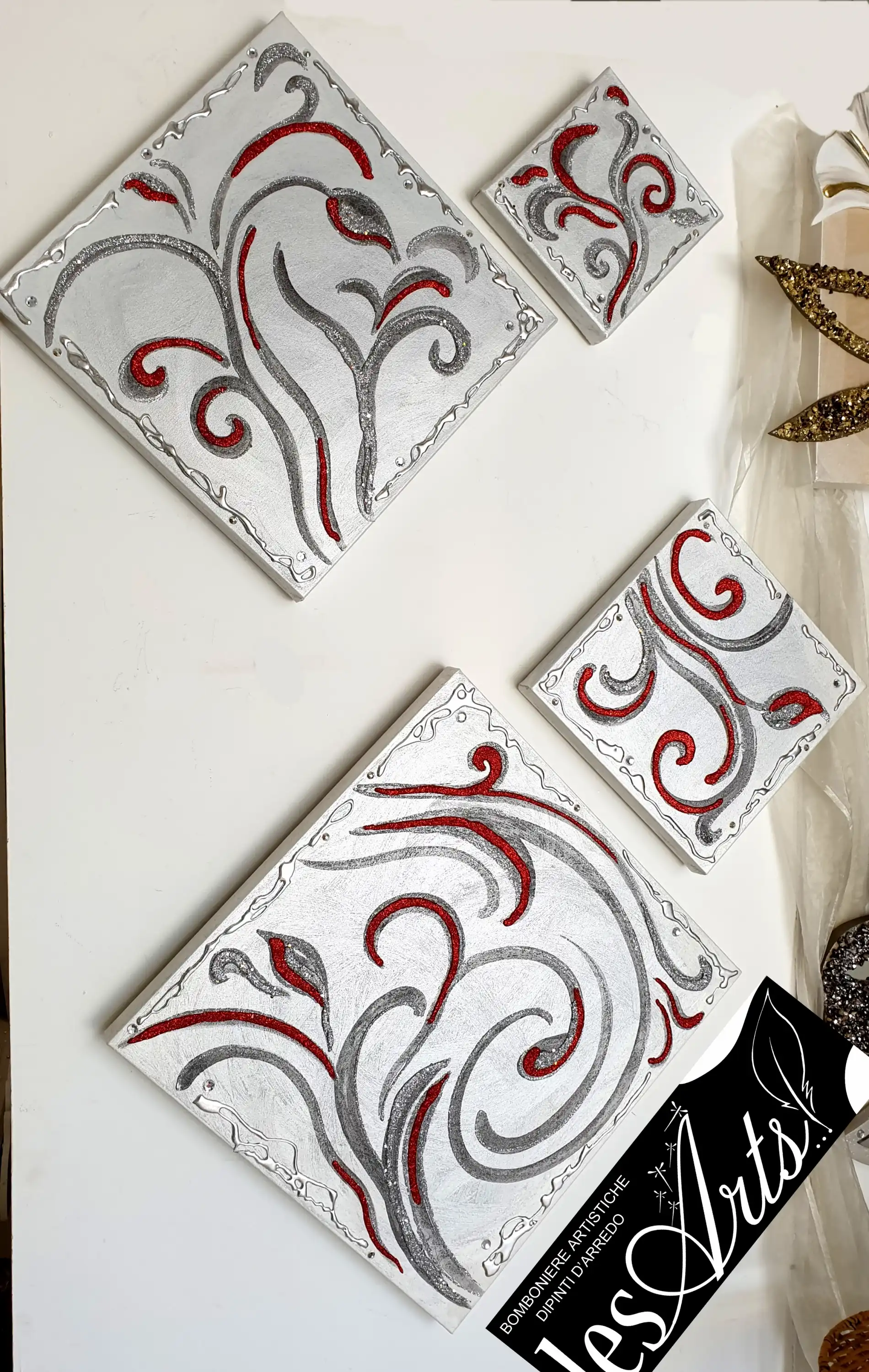 Scomposto caratterizzato da 4 tele gallery Misure: 50x50 ; 40x40 ; 30x30; 20x20. Interamente realizzate dipinte e decorate a mano. Tempi di realizzazione 15 gg lavorativi circa Per maggiori informazioni WhatsApp 328-9210448
