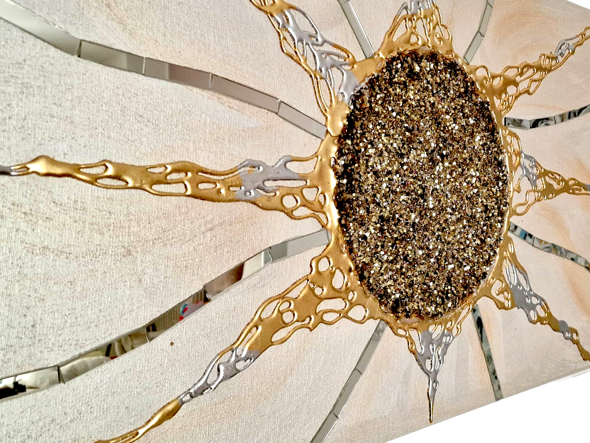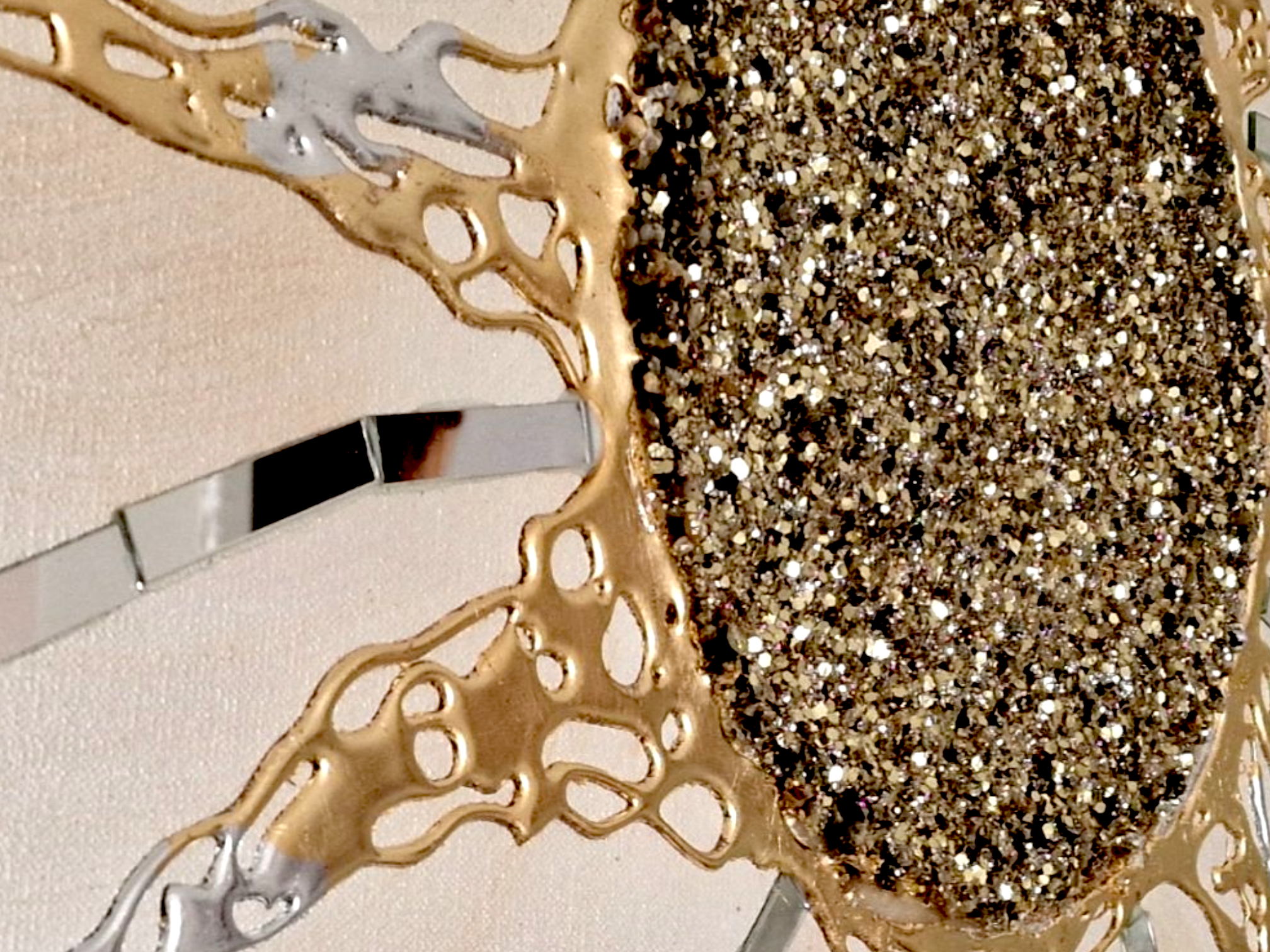 Impreziosito da particolari a rilievo in foglia Oro e Argento. Sole in pietre decorative glitterate e Specchietti.