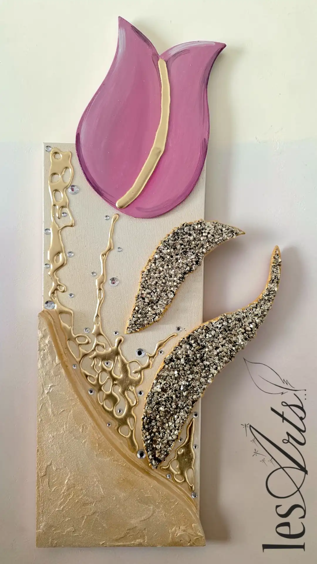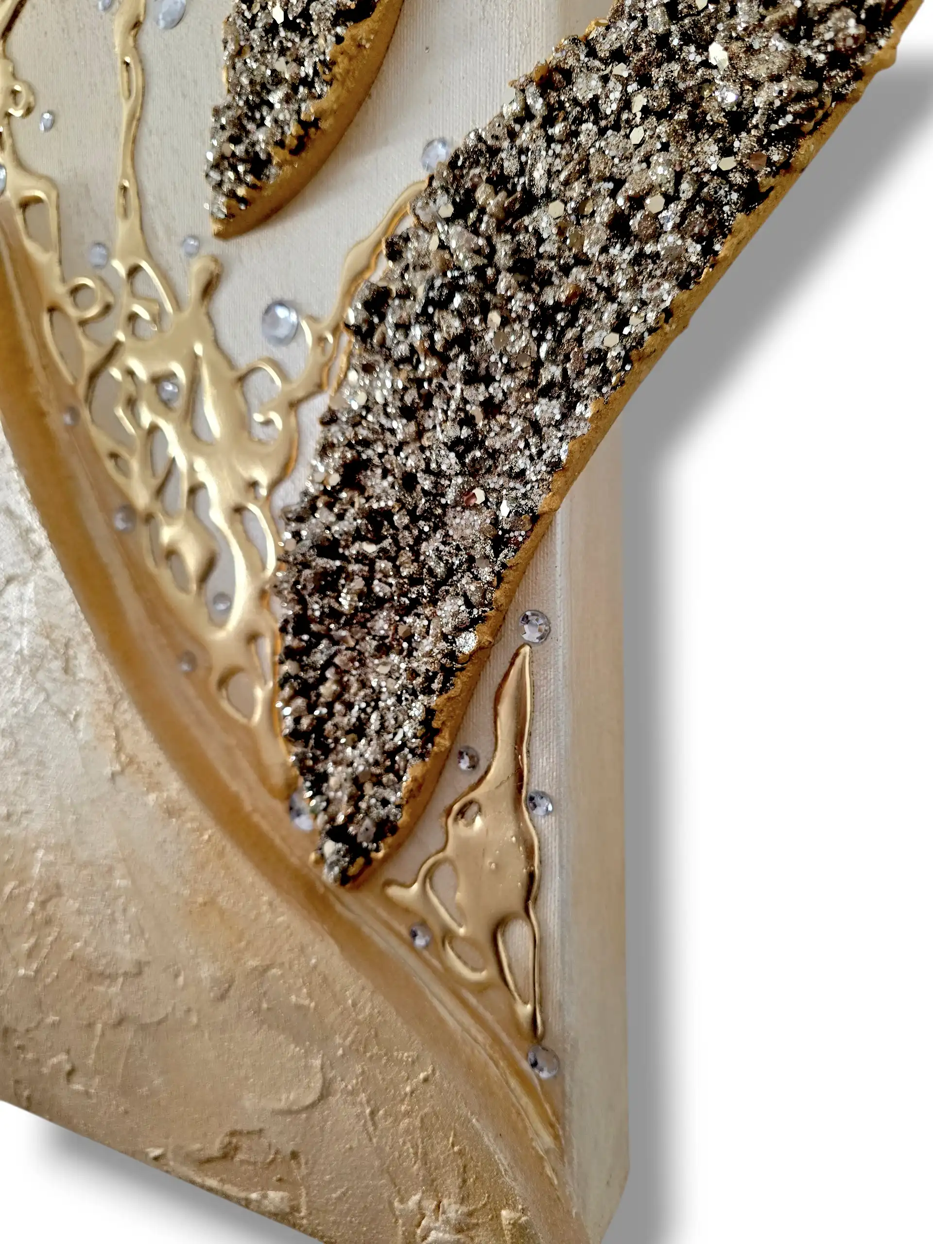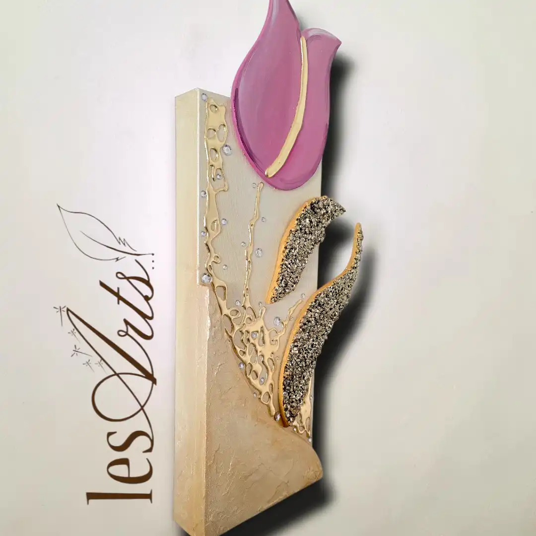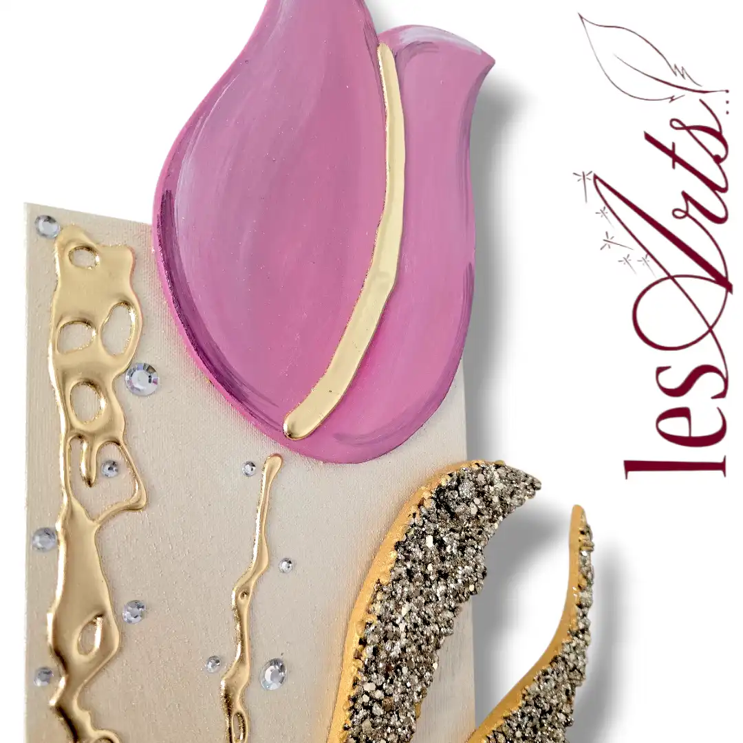 Impreziosito da inserti in legno arricchiti da pietre decorative glitterate, particolari a rilievo in foglia Oro e Strass. I dipinti Les Arts sono realizzati mediante la scelta di materiali di altissima qualità la tela è stesa su un telaio stondato in abete stagionato che dona al bordo un effetto cornice, le tele sono già pronte da appendere e fornite di attaccaglie per la posa in opera. Prodotto 100% made in italy