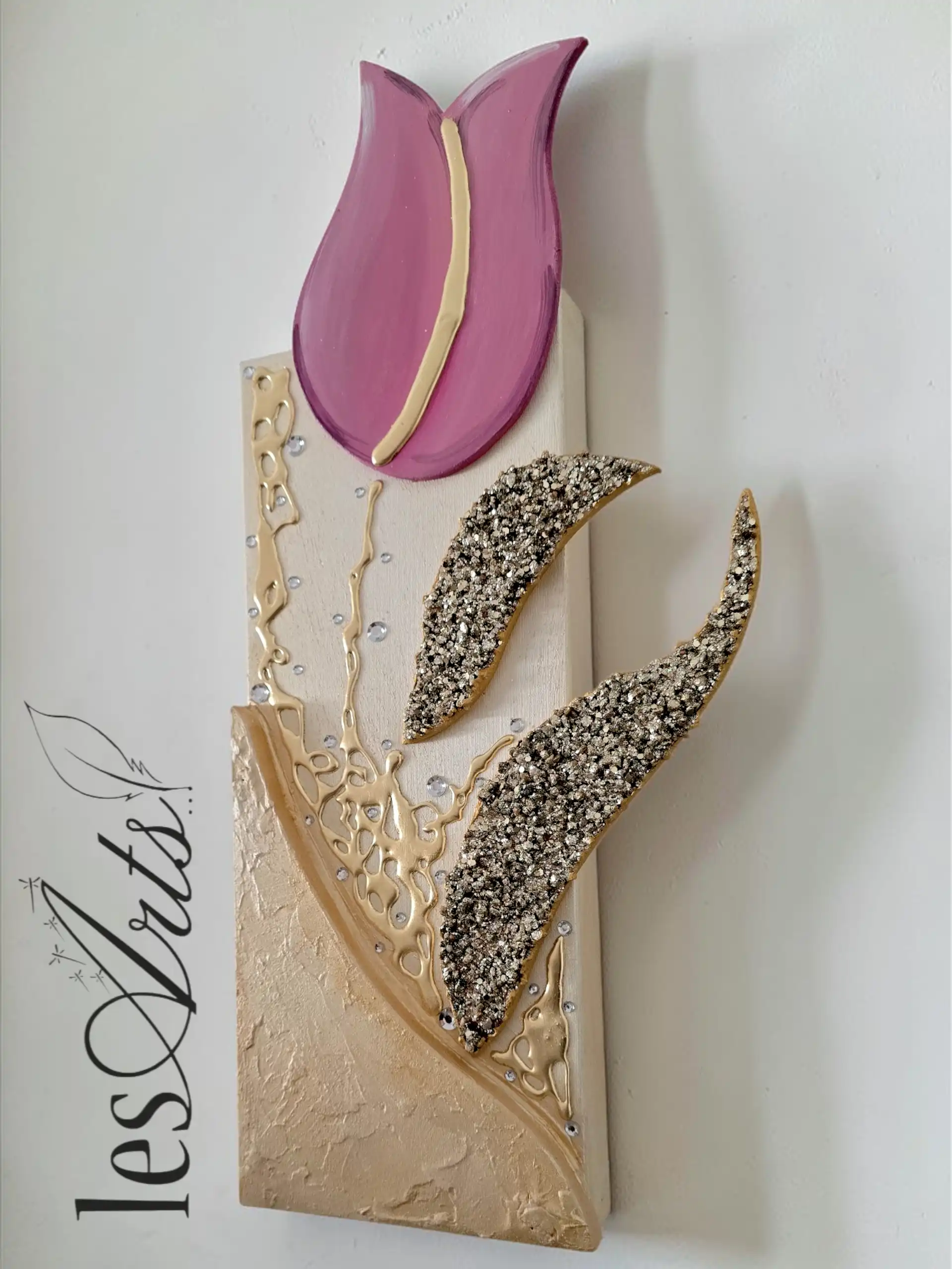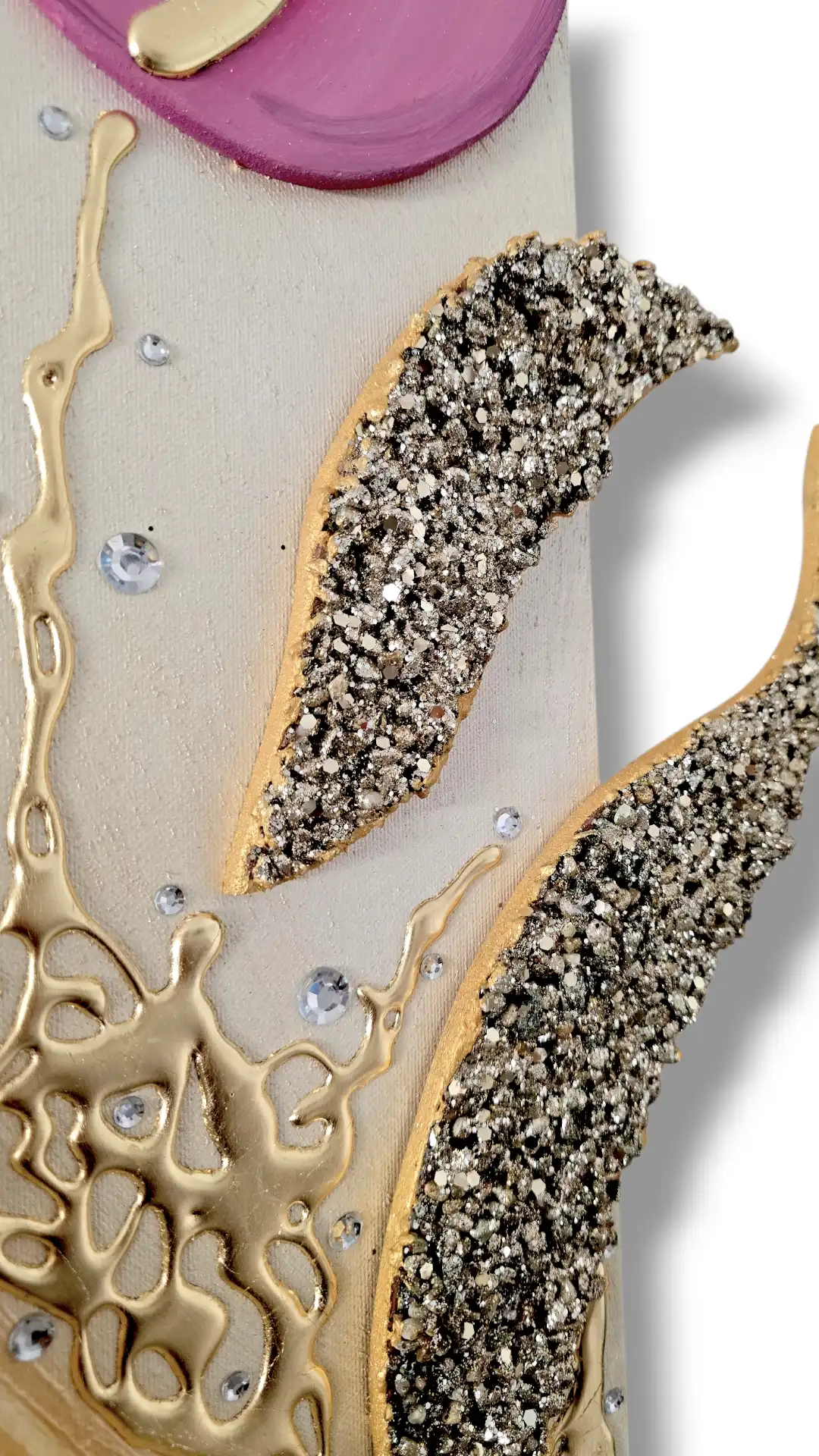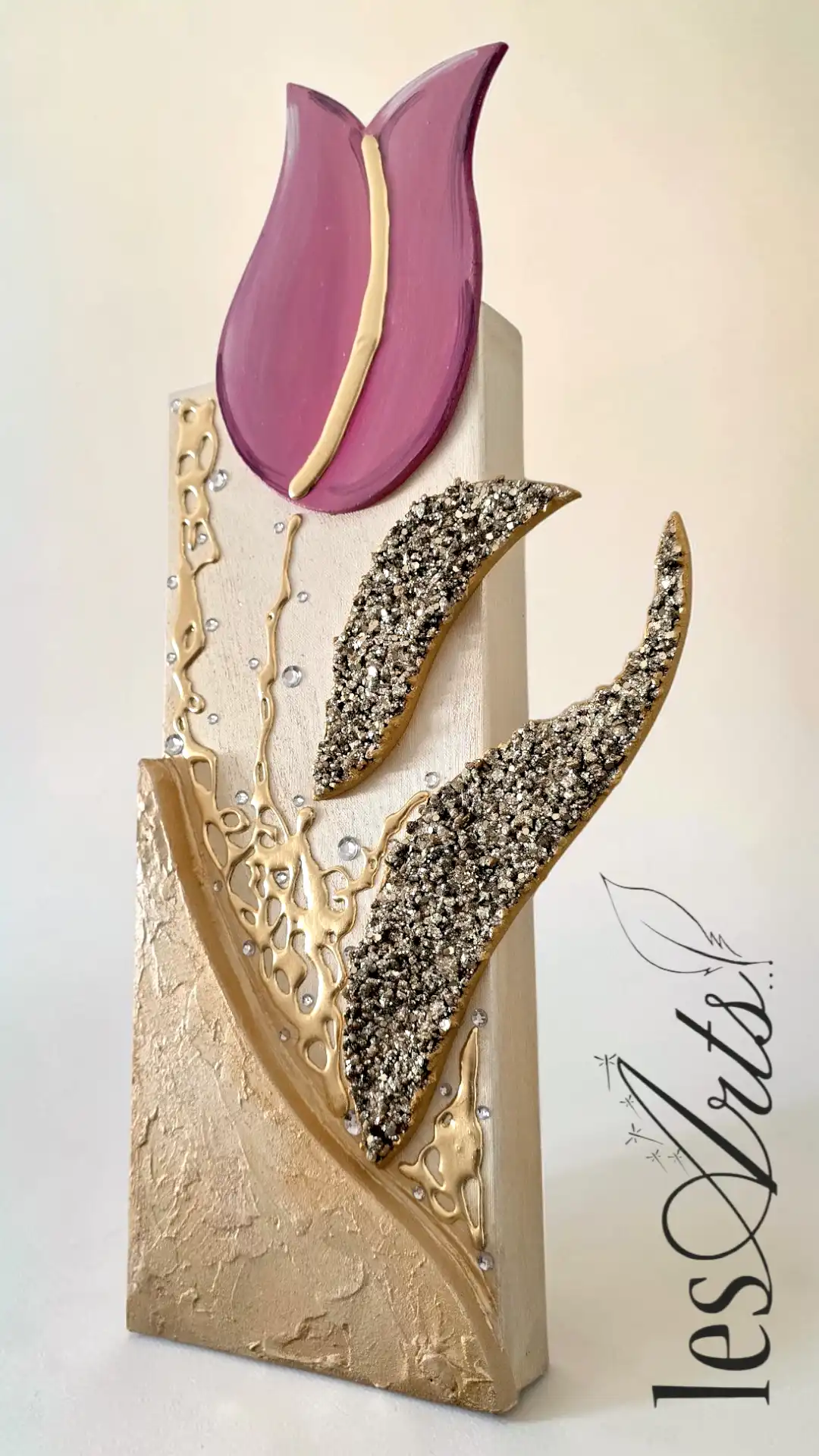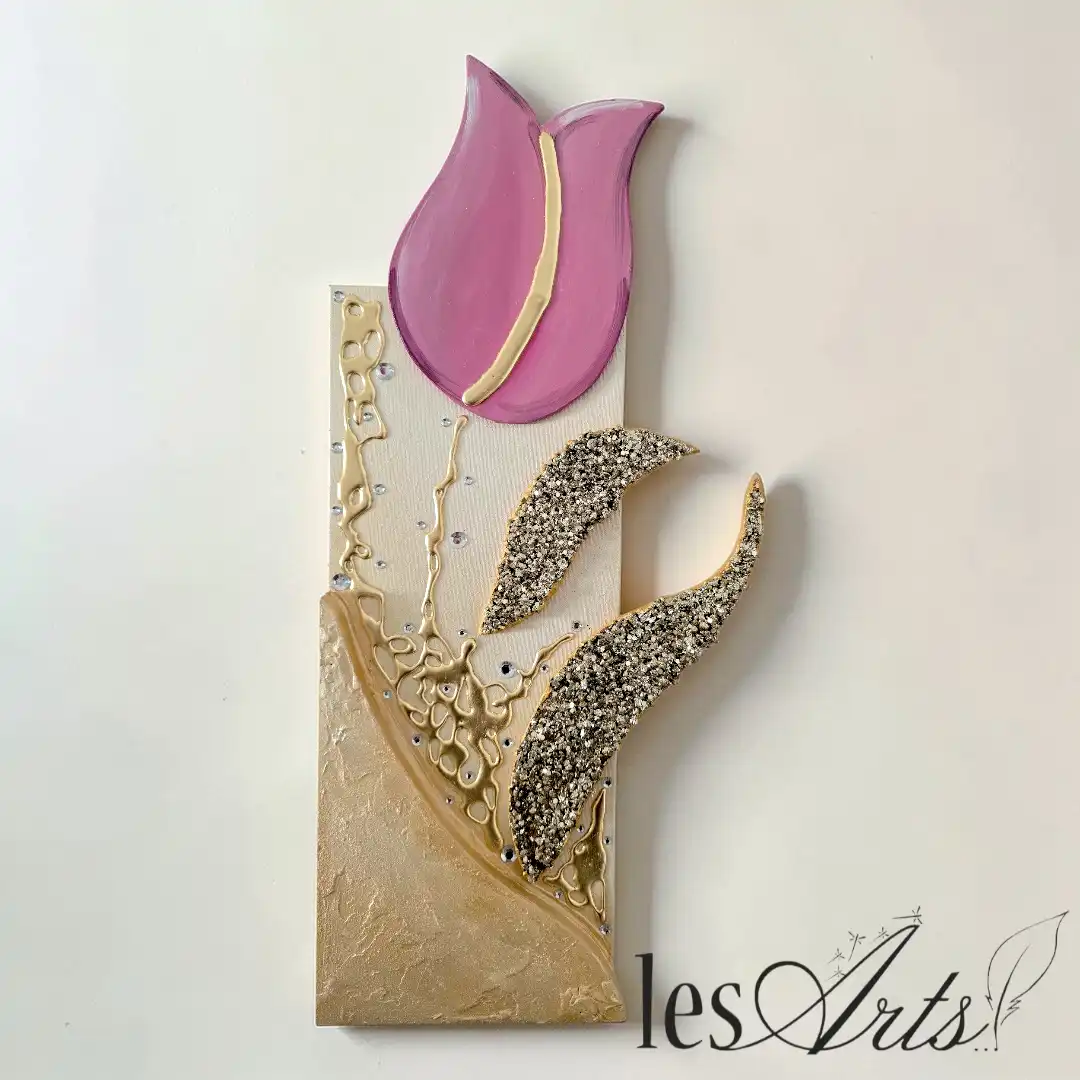 Impreziosito da inserti in legno arricchiti da pietre decorative glitterate, particolari a rilievo in foglia Oro e Strass. I dipinti Les Arts sono realizzati mediante la scelta di materiali di altissima qualità la tela è stesa su un telaio stondato in abete stagionato che dona al bordo un effetto cornice, le tele sono già pronte da appendere e fornite di attaccaglie per la posa in opera. Prodotto 100% made in italy