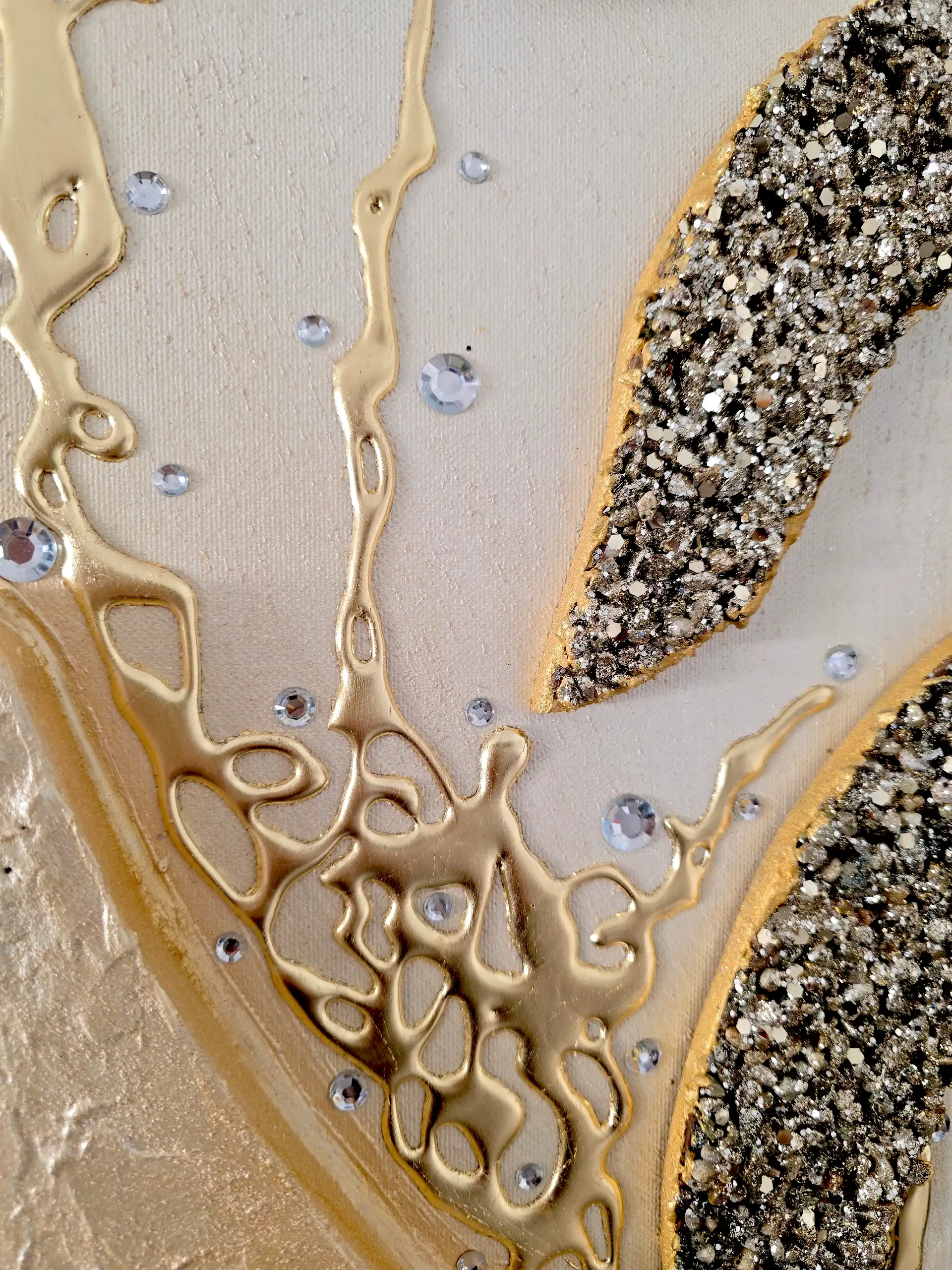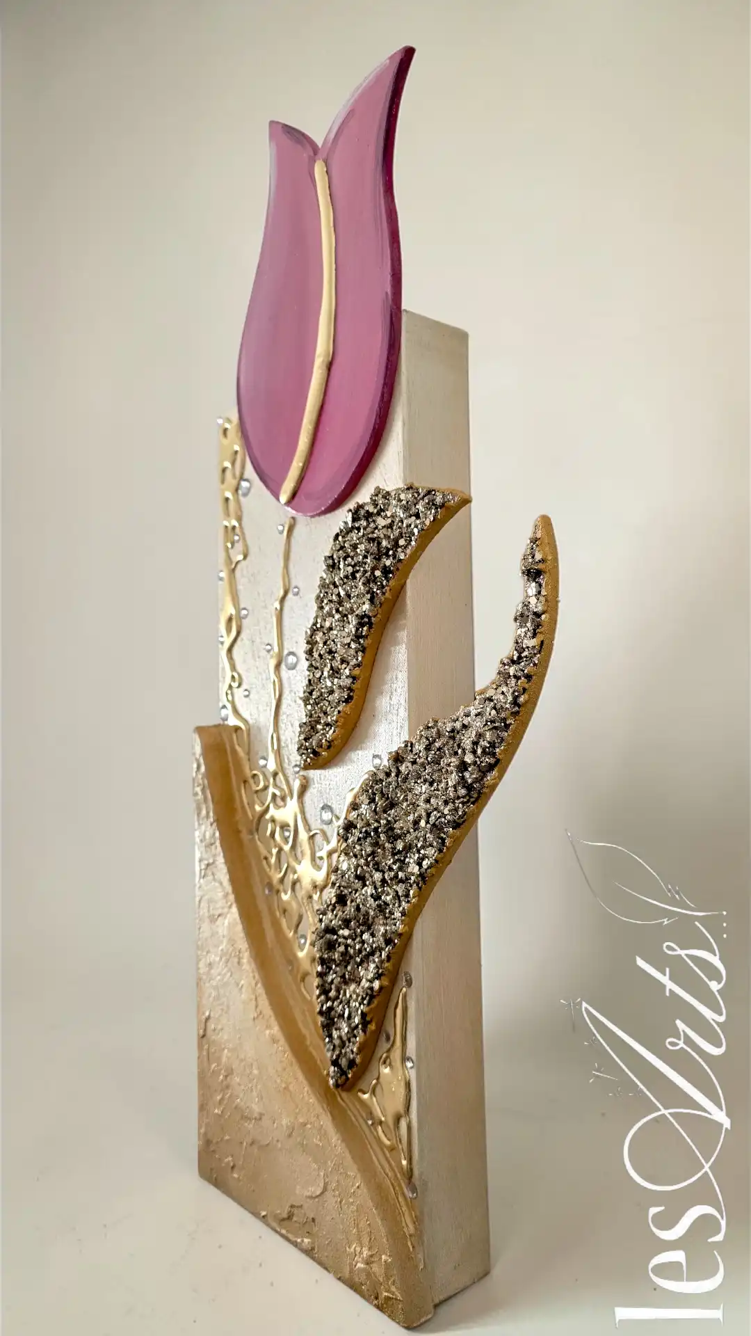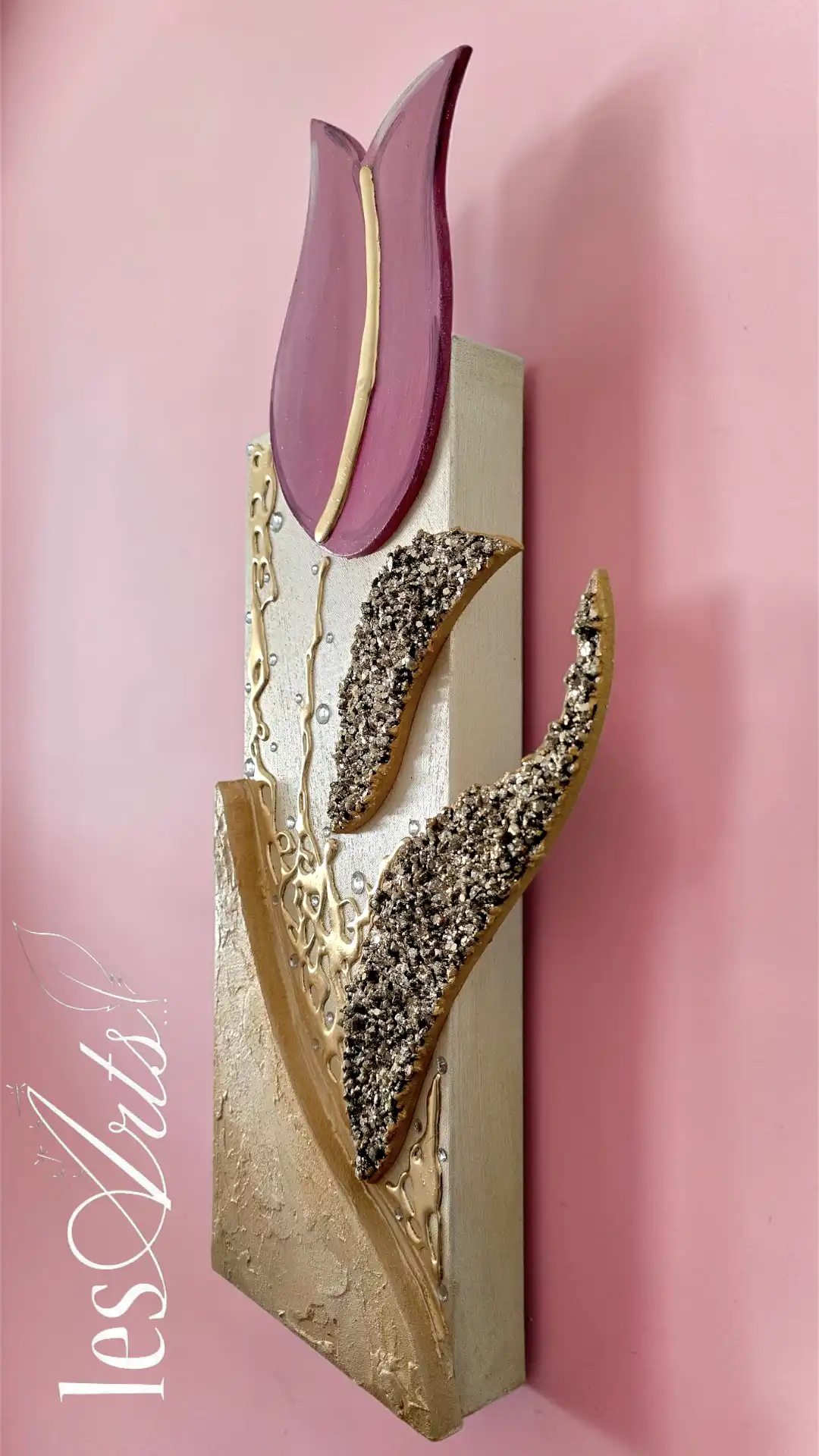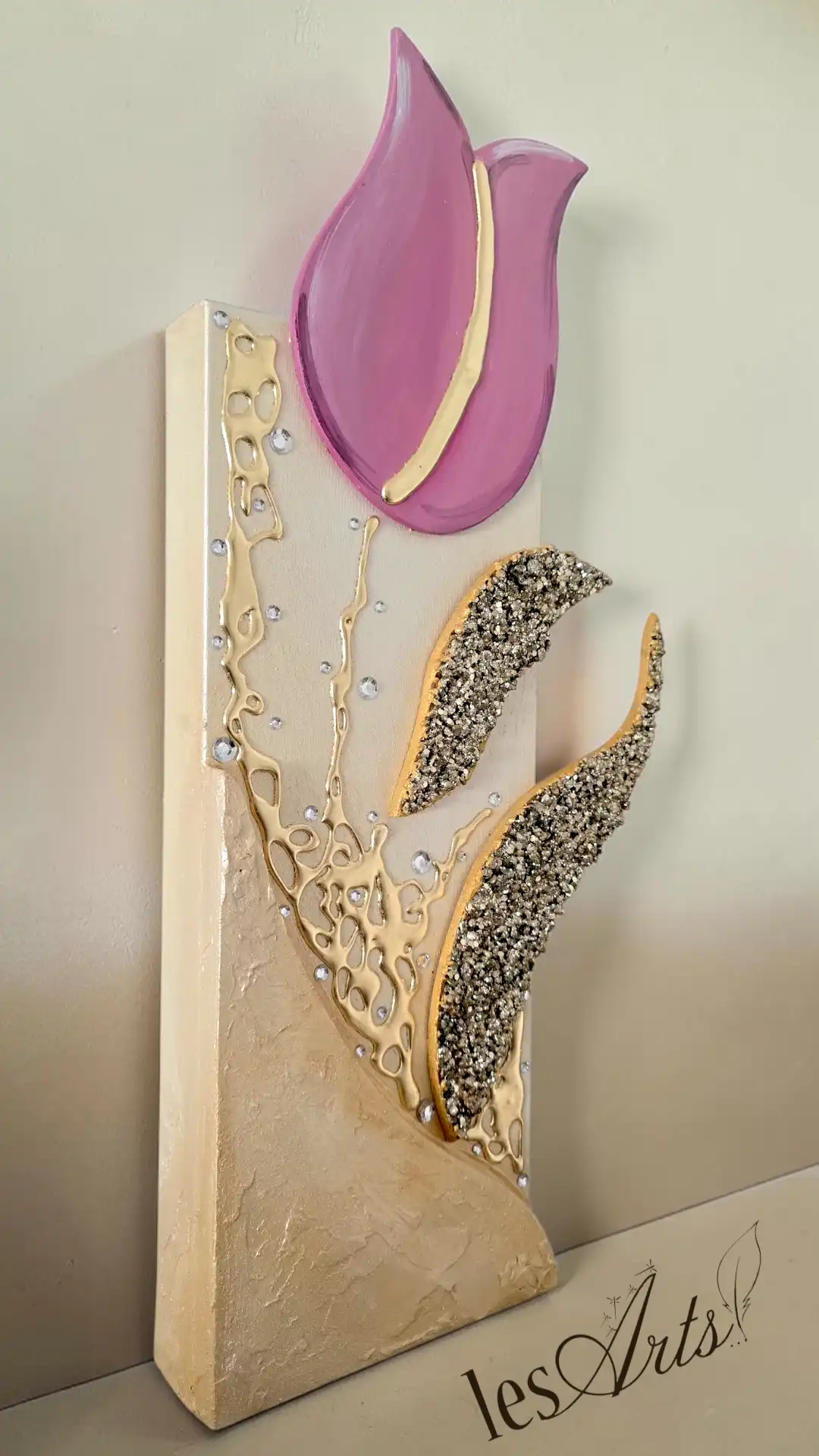 Impreziosito da inserti in legno arricchiti da pietre decorative glitterate, particolari a rilievo in foglia Oro e Strass. I dipinti Les Arts sono realizzati mediante la scelta di materiali di altissima qualità la tela è stesa su un telaio stondato in abete stagionato che dona al bordo un effetto cornice, le tele sono già pronte da appendere e fornite di attaccaglie per la posa in opera. Prodotto 100% made in italy